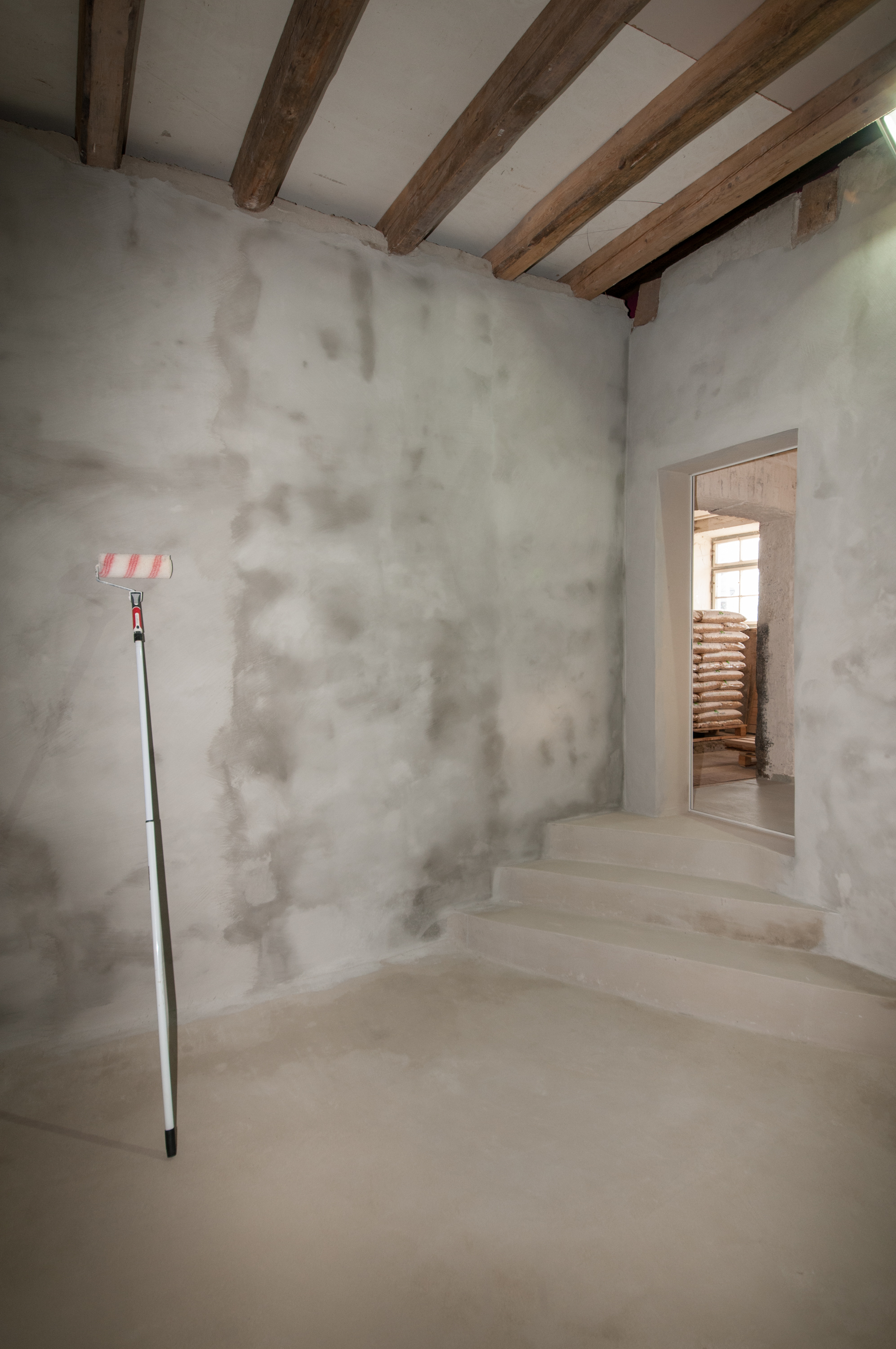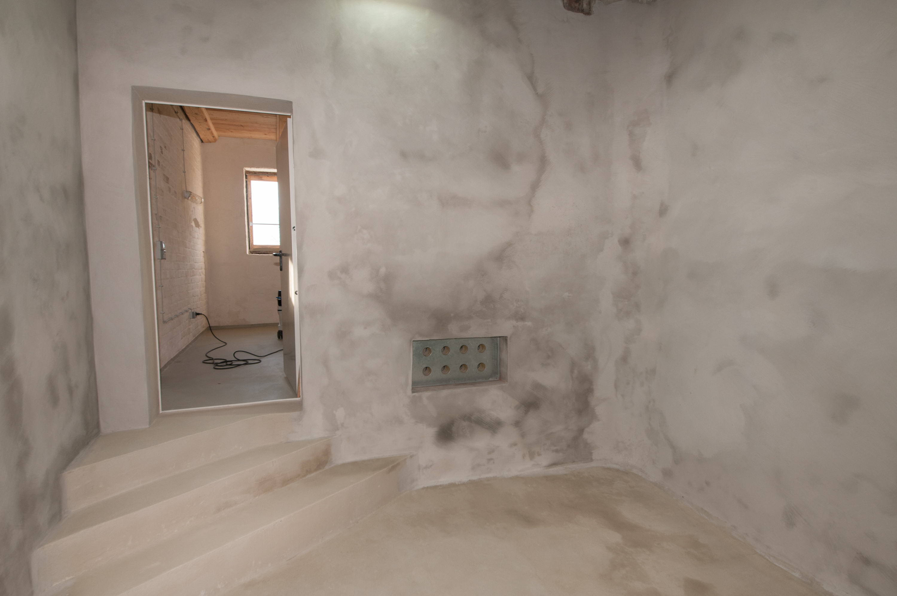 Gute 500 Schrauben später ist die Verwandlung des alten Silos in einen Pelletbunker schon deutlich zu erkennen. Der Aufbau des Traggebälks für das Schrägbodenlager geht schneller, als ich erwartet hätte.Rückblick (virtuelles Zurückspulen des Films): Im Juli hatte ich es endlich geschafft, die Wände des Silos abzufräsen: https://www.hausen8.de/artikel/drecksarbeit. Im Herbst hatte ich dann versucht, die Wände mit einer Schicht Zementputz glatt zu kriegen, was sich mangels Routine weniger professionell aussah. Ein zweiter Versuch, die restlichen Unebenheiten mit einem Zementspachtel auszugleichen, brachten auch kein befriedigenderes Ergebnis. Da ich offensichtlich kein Händchen für glatte Wände habe, blieb nur die Wahl, entweder weitere Schichten auf den Wänden verteilen oder jemanden bitten, der das besser kann, als ich.