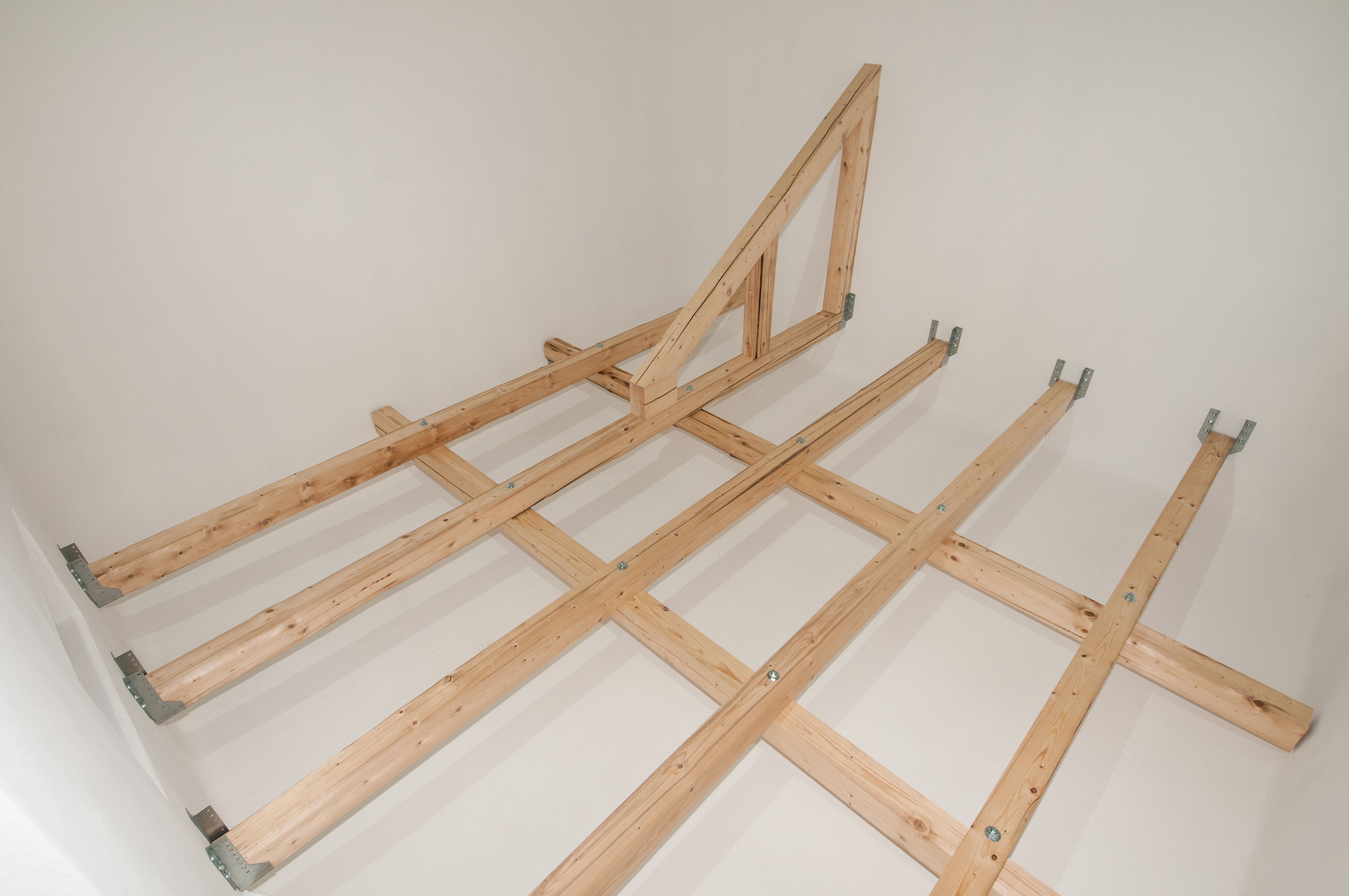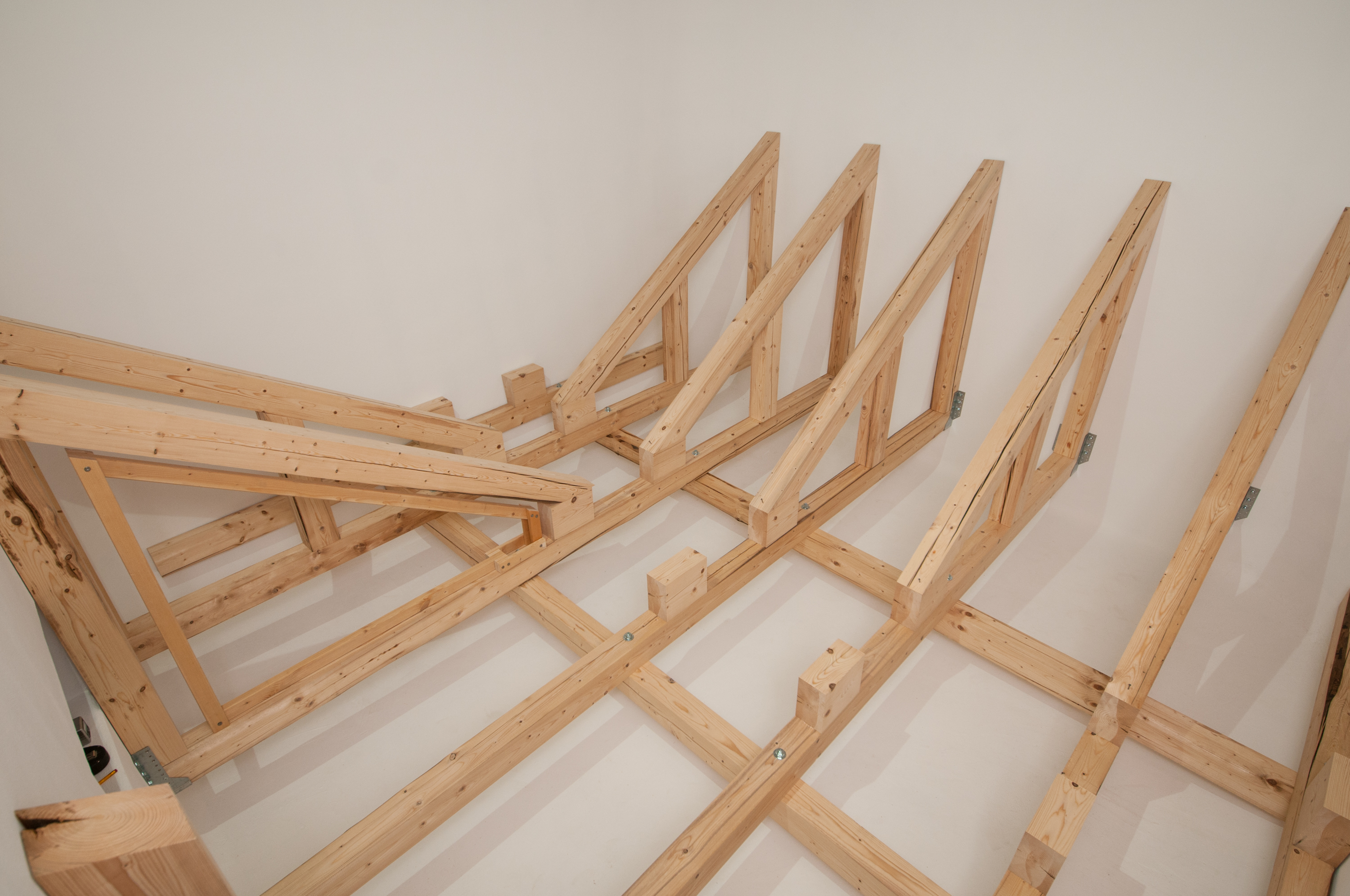 Nachdem der Graben in der Mitte auf den Querbalken angezeichnet war, wurden die Blöcke, auf denen die Sparren ruhen, in zwei Reihen ausgerichtet und einfach provisorisch aufgeleimt, um sie in Position zu halten. Die Idee, dass die hinteren Stützen den Winkel der Schräge vorgeben, muste ich jedoch fallen lassen: Wenn die Stützen an der Wand anliegen sollen, sind sie bis zu 3 Zentimeter unterschiedlich weit vom Zentrum entfernt, was den Winkel beeinflusst. Kurzerhand habe ich eine Winkellehre gefertigt, mit der ich alle Balken ausrichten konnte. Damit gingen die nächsten Arbeitsschritte auch flott von der Hand.
