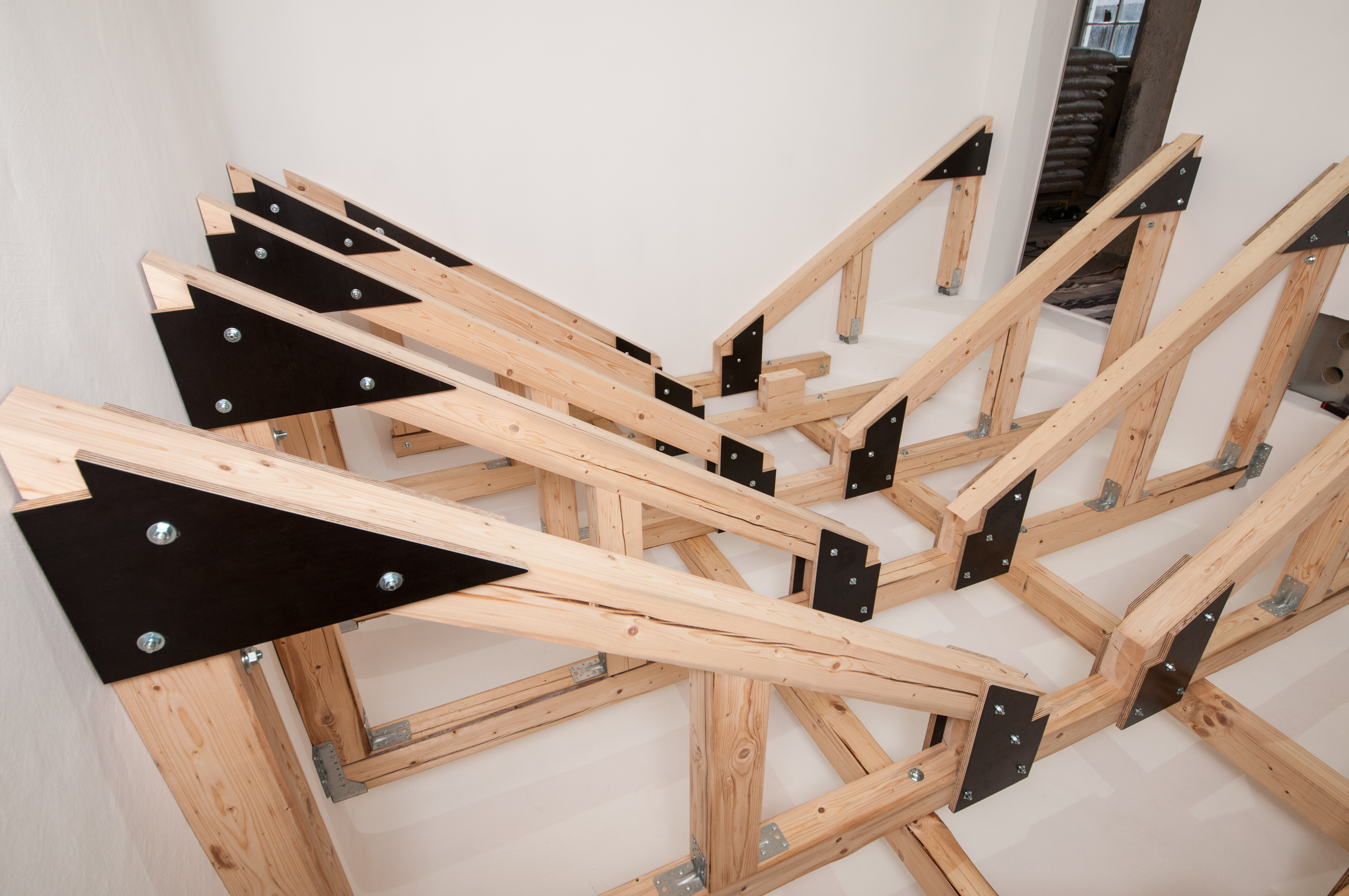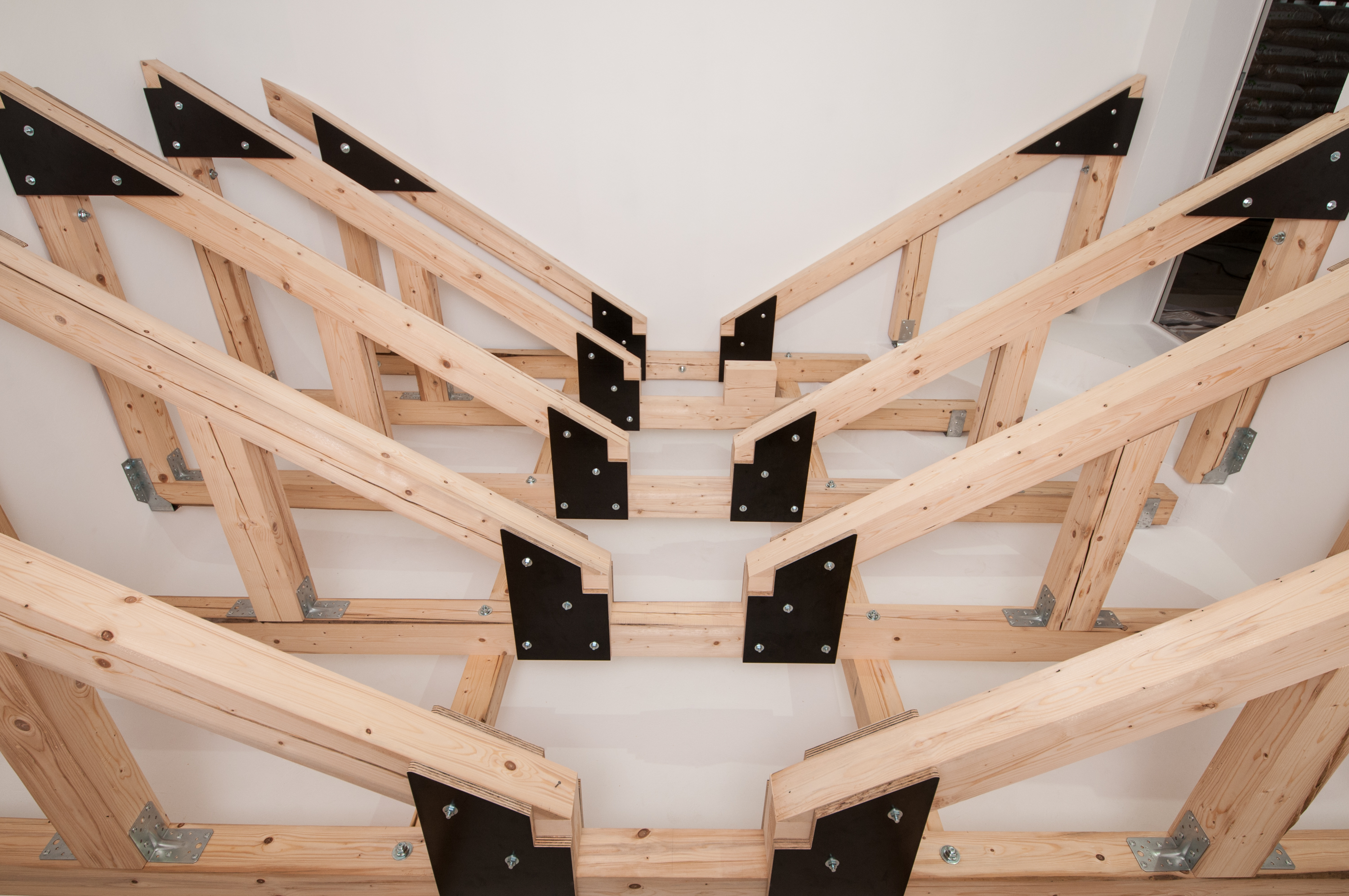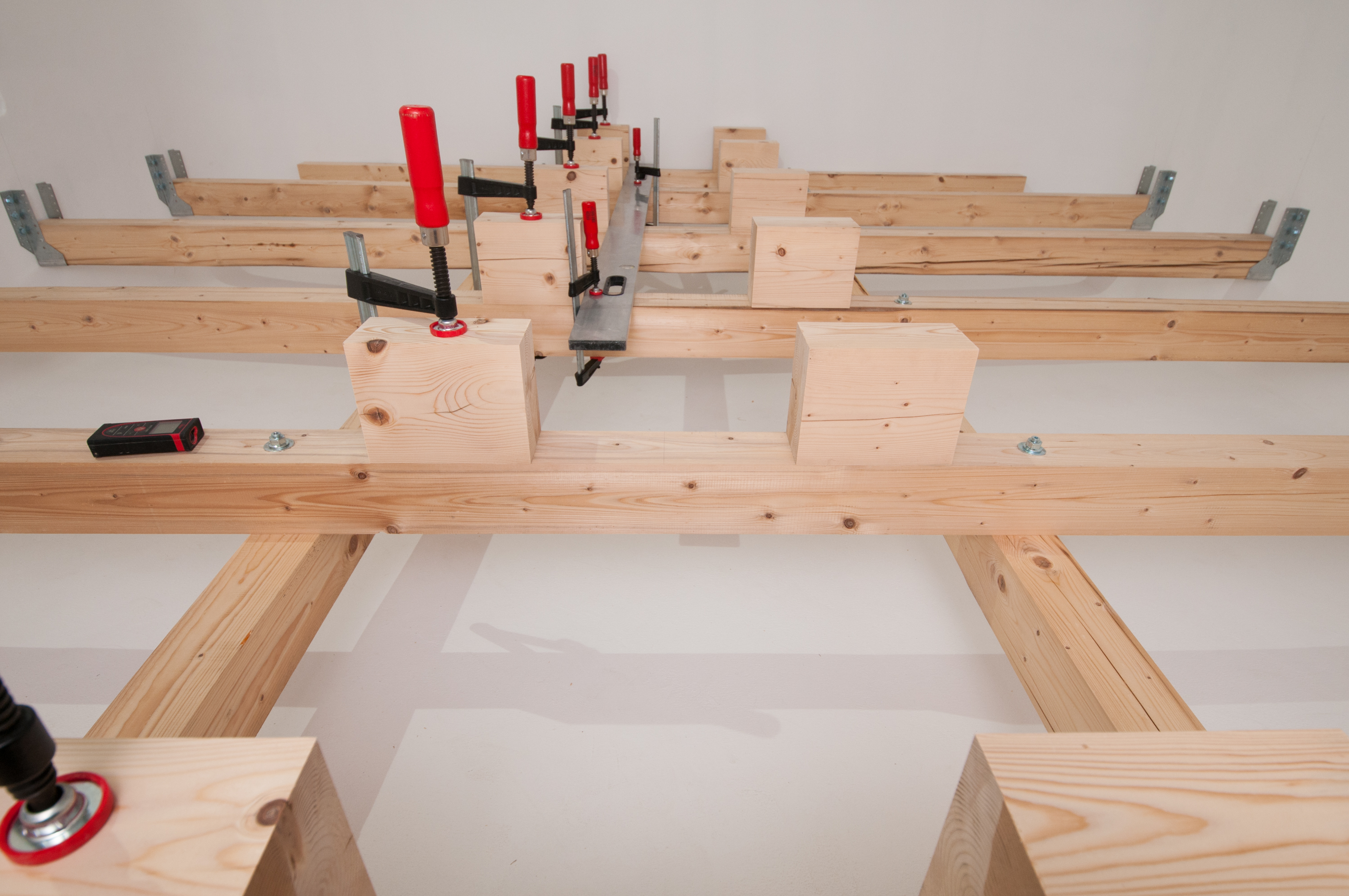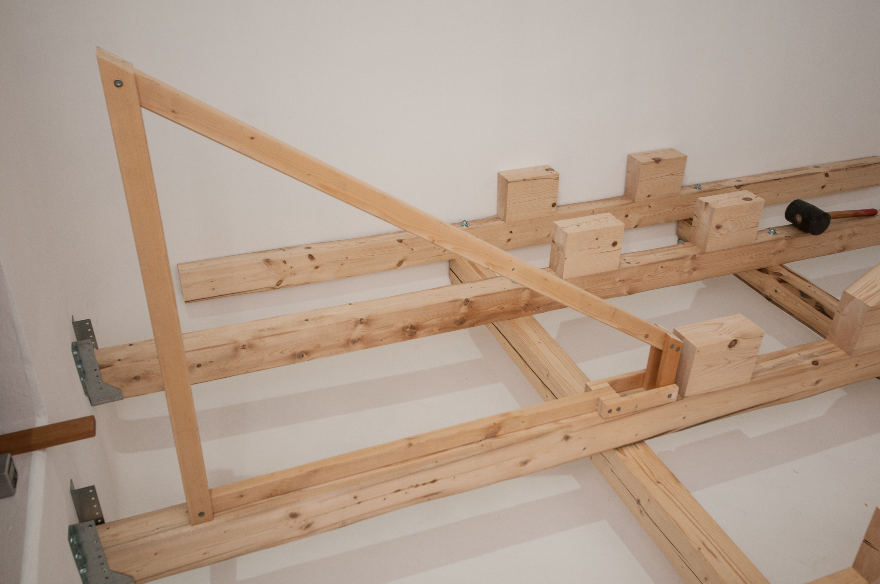 Nach etlichen Balkenschuhen, Winkelverbindern und Stockschrauben ging es an die Montage der Siebdruckwinkel. Sie dienen zum einen der Aussteifung, zum anderen auch als Auflager für die Querbalken. Die Vorstellung, dass sich die strukturierte Rückseite der Siebdruckplatten an den Balken festbeißen, hat sich als voller Erfolg herausgestellt: Mit Schlossschrauben und Muttern verspannt ergibt sich eine stocksteife Verbindung.