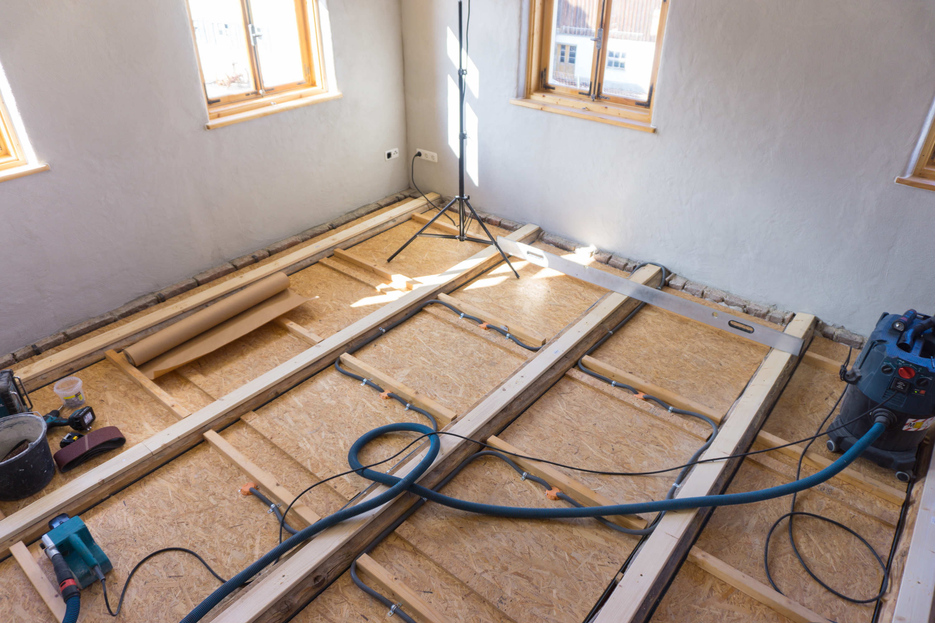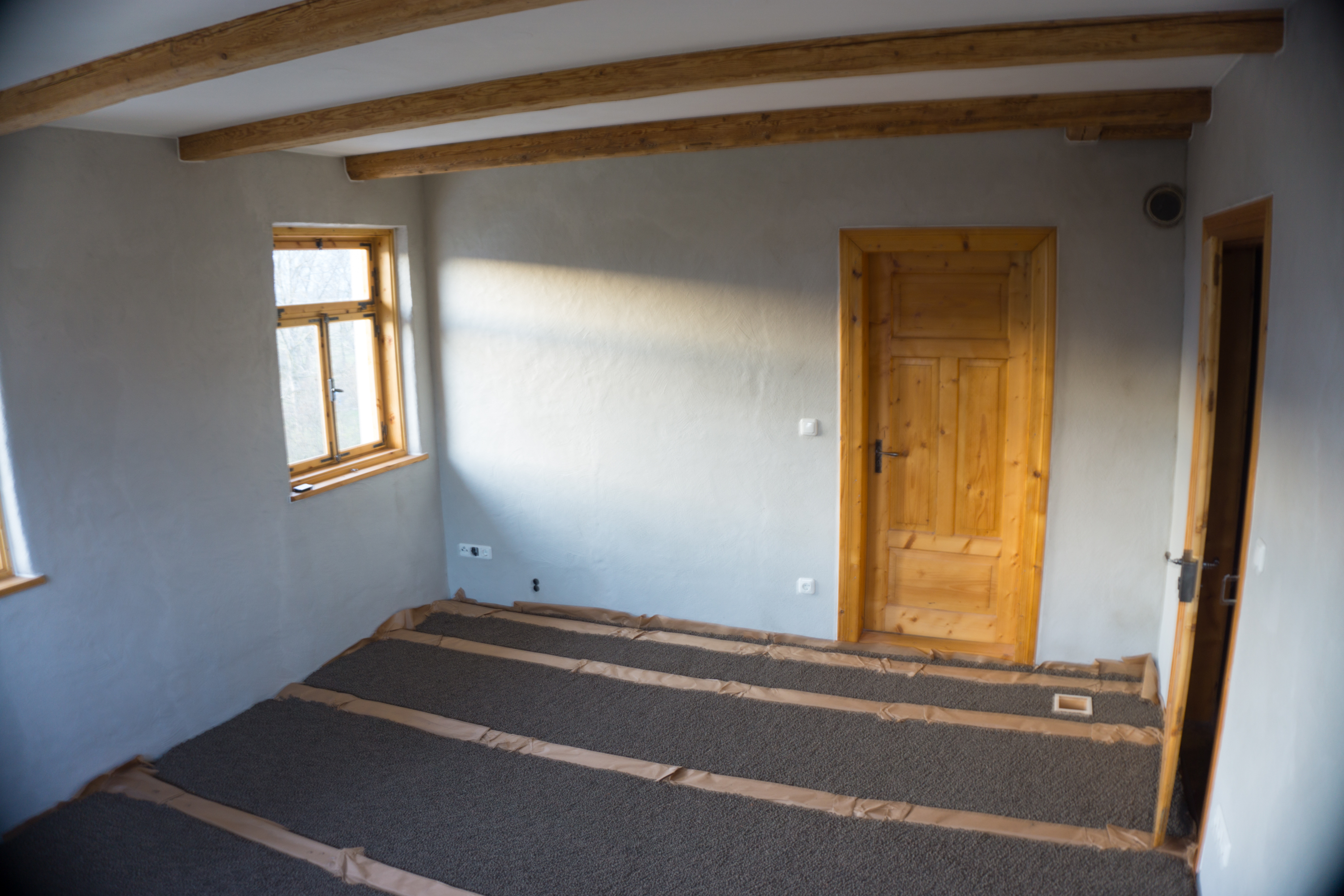 Mittlerweile ist auch der Dielenboden im Schlafzimmer wieder verlegt. Bis auf wenige Ausnahmen wurden alle alten Dielen aufbereitet und wiederverwendet. Als besonderes Extra hat der Boden ein Loch bekommen.Ein Boden mit Loch? Na klar, aber dazu später mehr. Zuerst mussten die Balken wieder um die gleichen 27 Millimeter aufgestockt werden, wie schon in den anderen Räumen. Der Hauptgrund dafür liegt in den Heizungsrohren der Deckenheizung, die über die Balken geführt wurden. Ebenso lassen sich dadurch die Leerrohre für die Beleuchtung einfach in der Decke von einem Feld ins nächste legen. Als angenehmer Nebeneffekt sind die Türschwellen nicht mehr 4-5 Zentimeter, sondern nur noch 1-2 Zentimeter hoch.