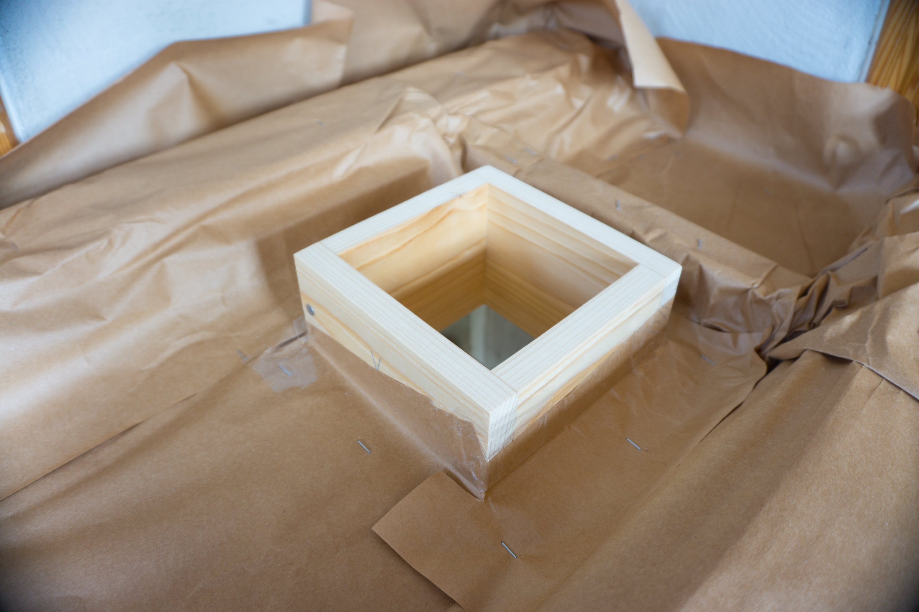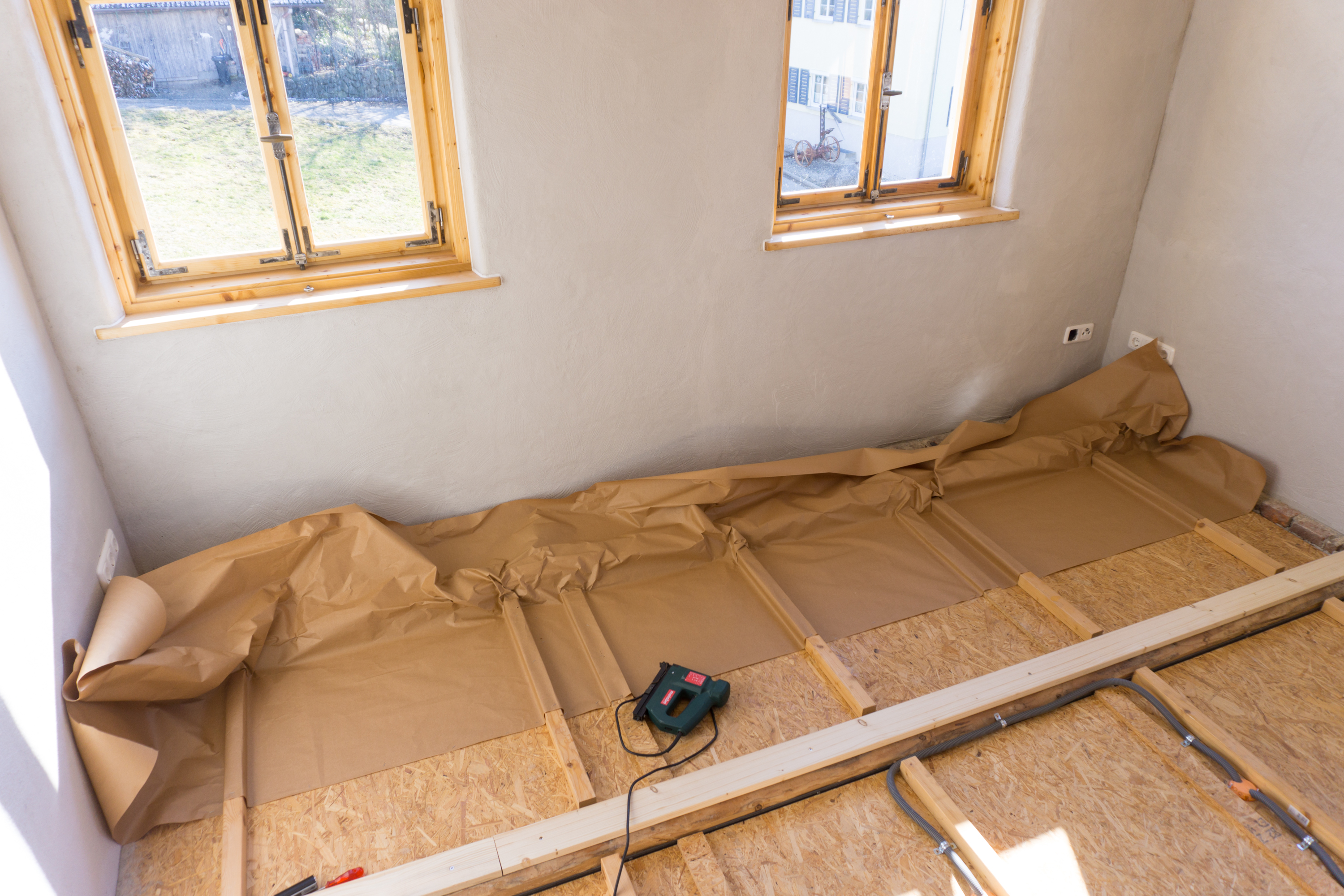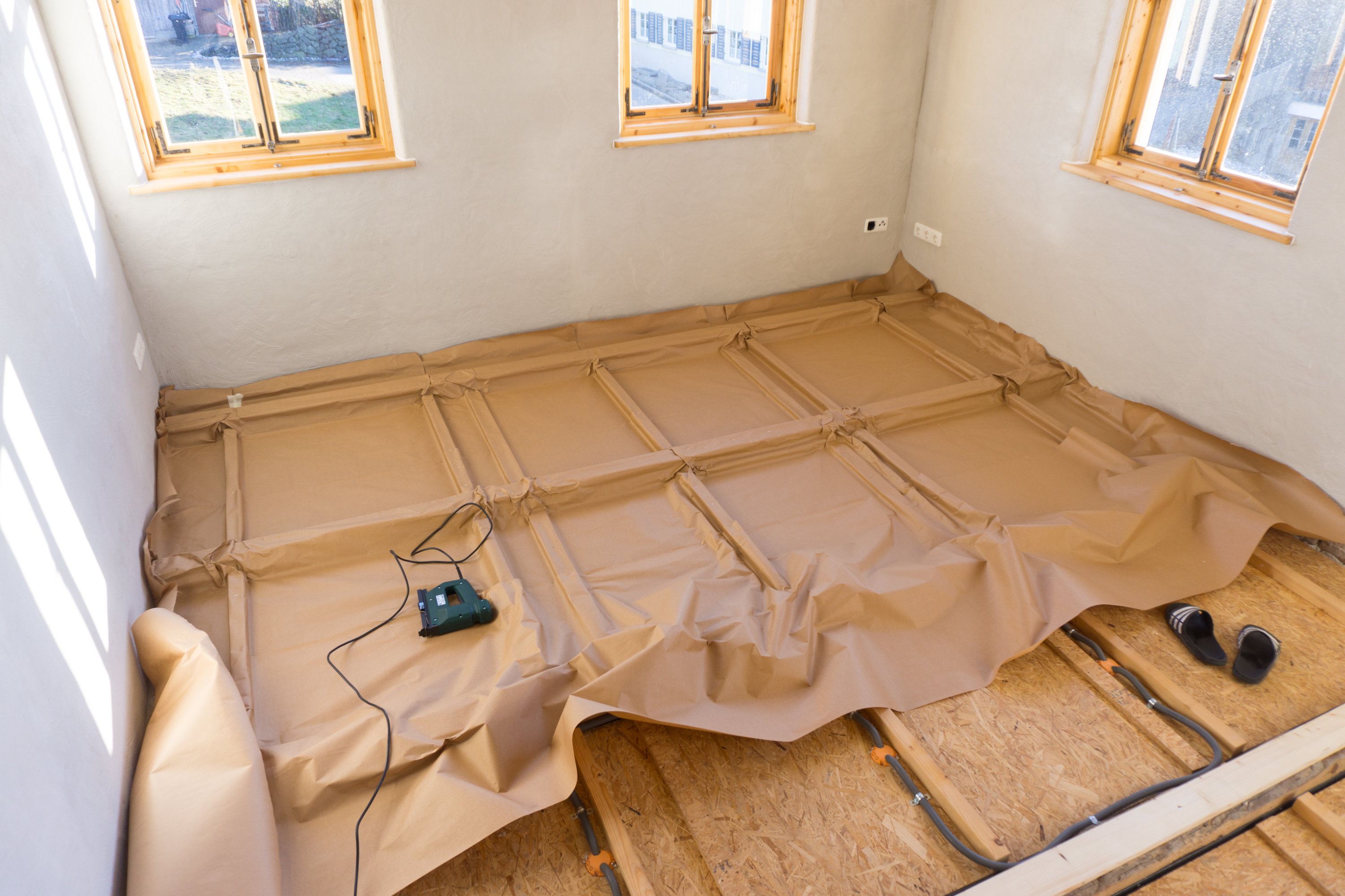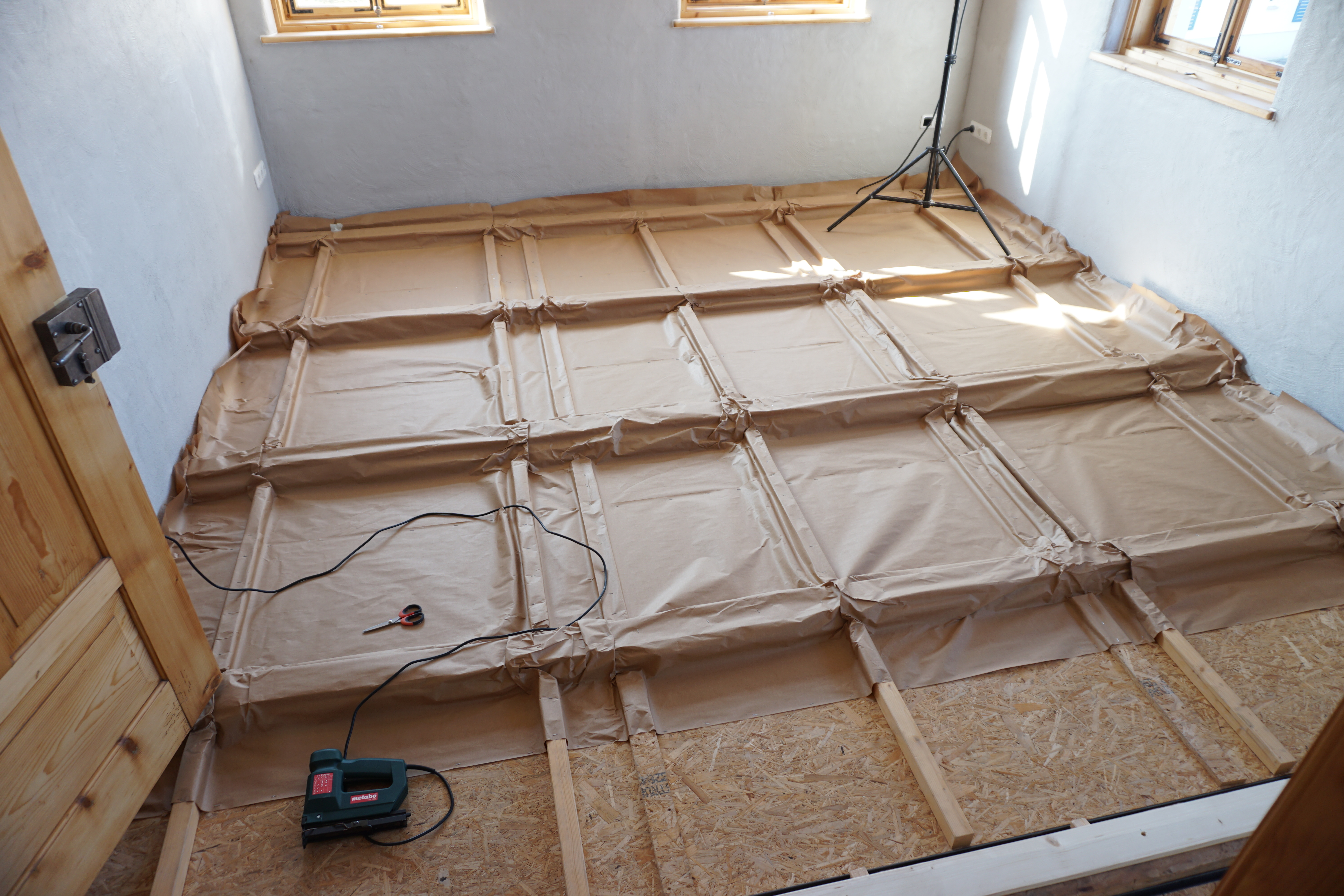 Der nächste Schritt ist unsere eigene Form von Origami: Das Rieselschutzpapier muss sauber um alle Balken, Querträger, Hohlwanddosen und Leerrohre herum gefaltet werden, damit es nirgendwo unter Spannung steht und später reißen kann. Man sollte meinen, dass Papier zu falten eine kinderleichte Aufgabe ist, doch in der Größe und Stärke ist Rieselschutzpapier ein wirklich störrisches Biest, das Kraft und Nerven kostet.