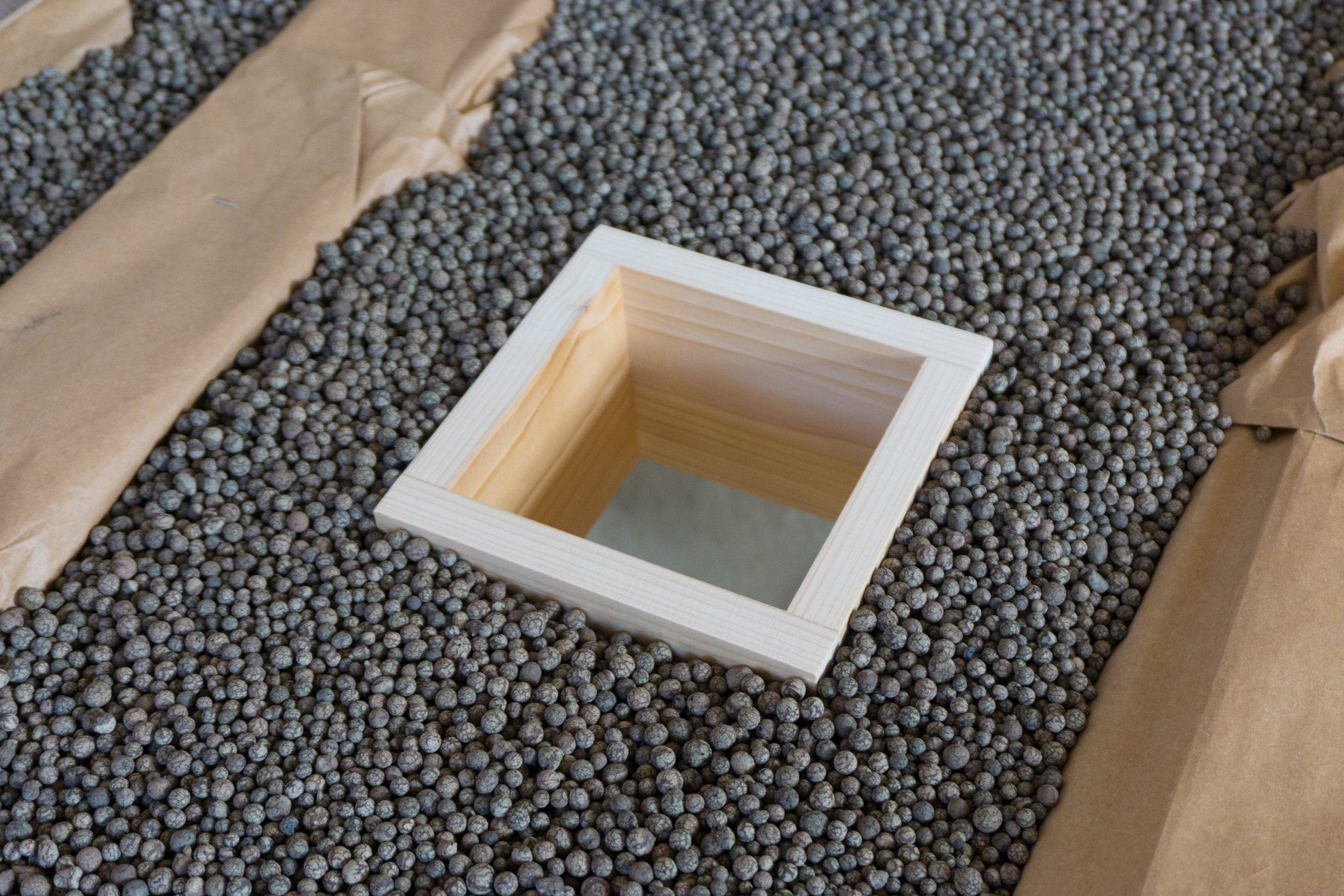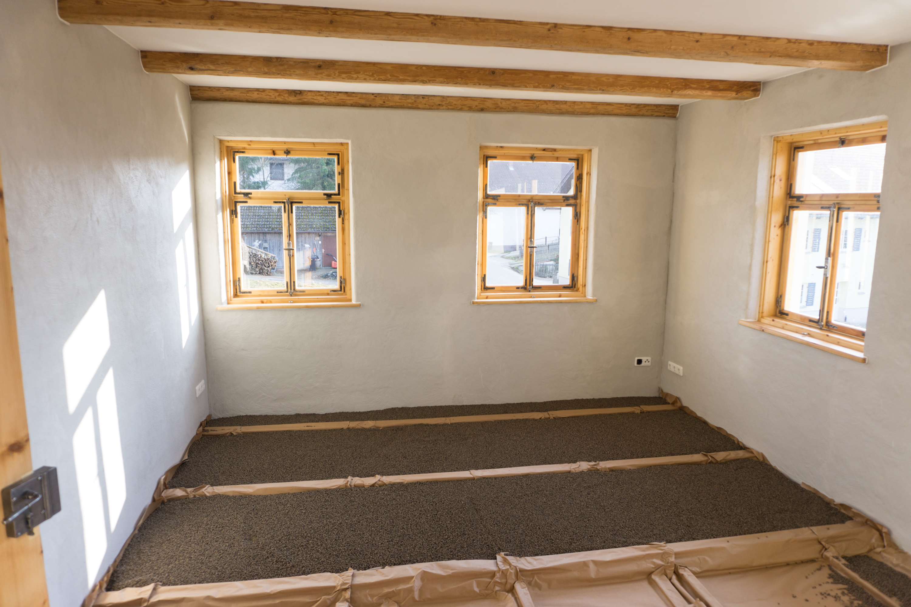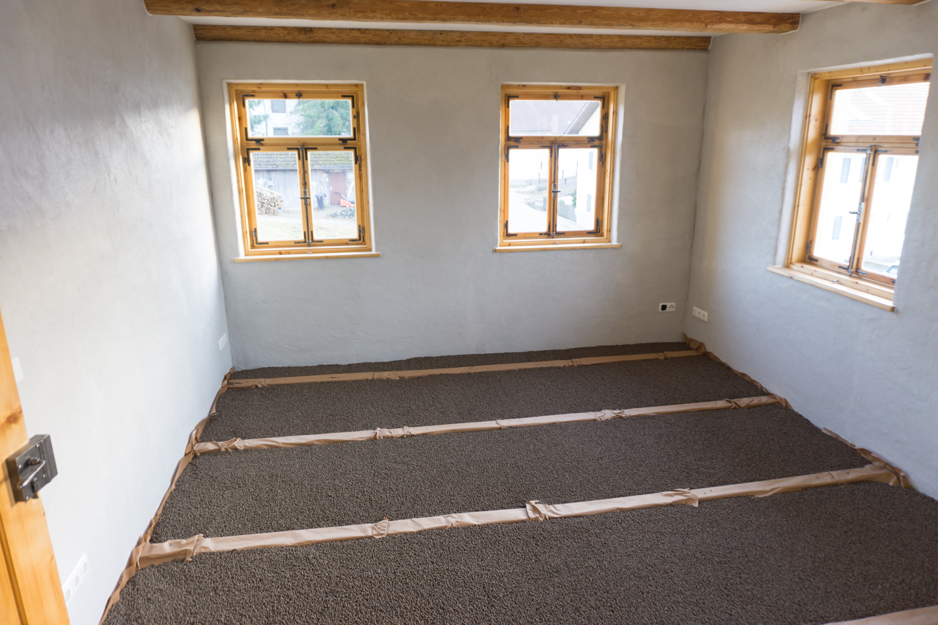 Die Schüttung einzubringen ist wiederum eine leichte und schnelle Arbeit. Ich bin jedes Mal wieder erstaunt, dass man in weniger als einer Stunde mühelos 600 Kilogramm Blähtonkügelchen in eine Zimmerdecke einbringen kann. Schlaue Erkenntnis aus den vorangegangenen Decken: Es lohnt nicht, die Schüttung gleich sauber abzuziehen. Man wird noch so oft hineintreten oder ein Werkzeug hineinfallen lassen, dass man es besser erst beim Einbau der Dielen Zug um Zug macht.