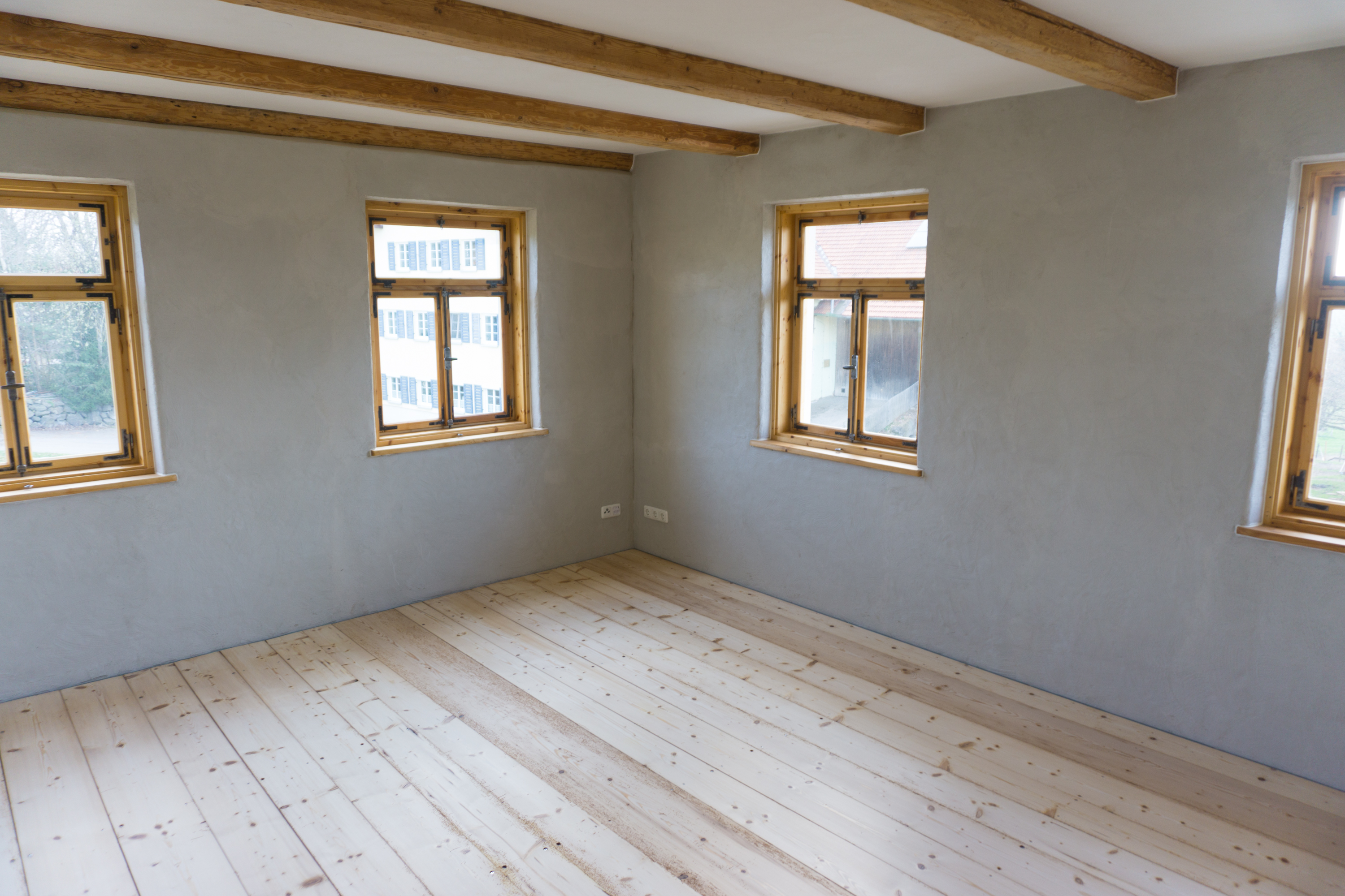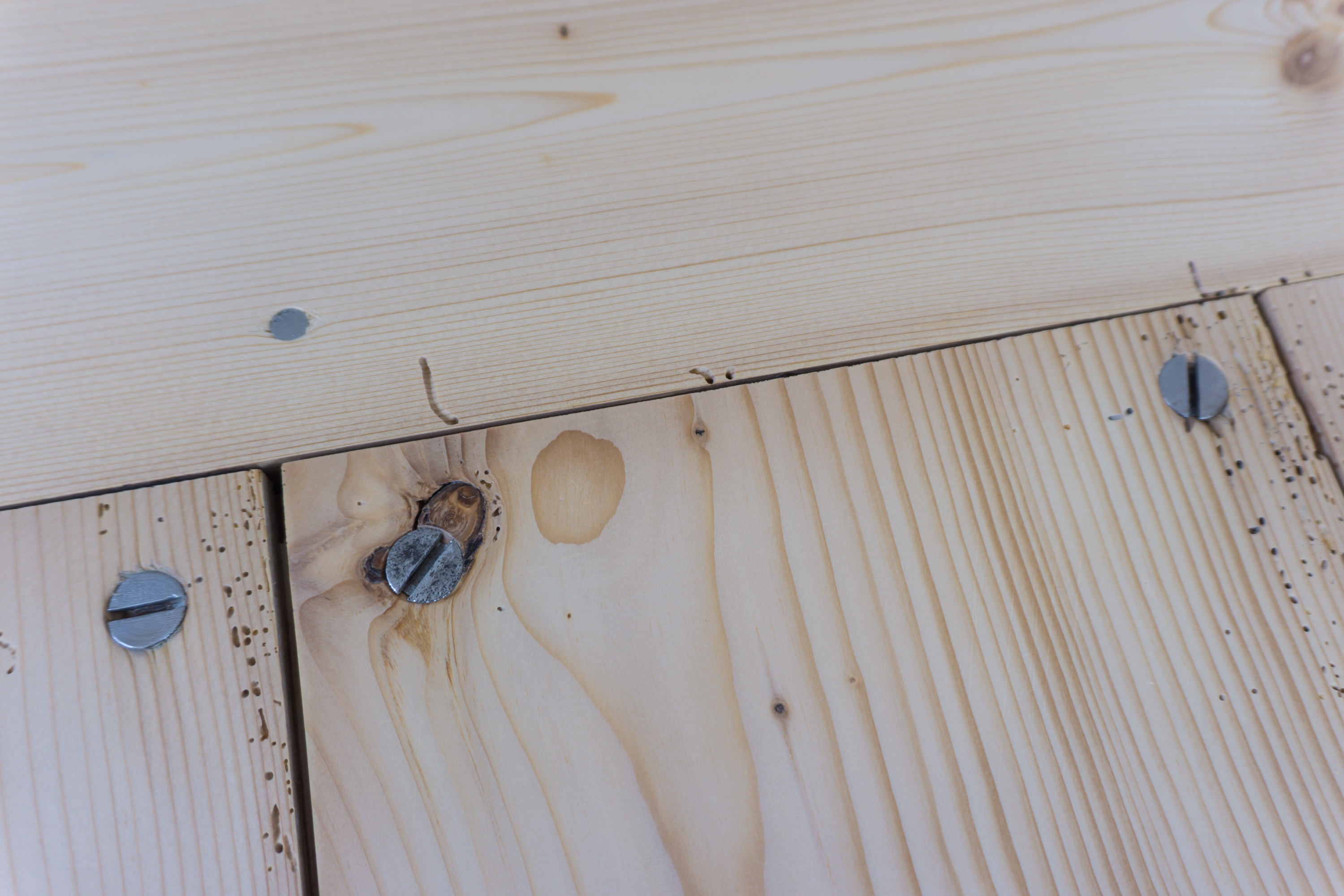 Mit den alten Dielen habe ich mir gleich zwei Mal selber einen Streich gespielt: Zum einen ist mir erst beim Einbau aufgefallen, dass sie vollkommen unterschiedliche Stärken zwischen 25 und 30 Millimeter haben. Der Grund für diese starken Unterschiede ist, dass die Dielen keine Nut und Feder hatte, sondern auf Stoß direkt auf die grob gebeilten Balken genagelt wurden. Die Unregelmäßigkeiten in der Höhe wurden anschließend durch Überschleifen des Bodens egalisiert.