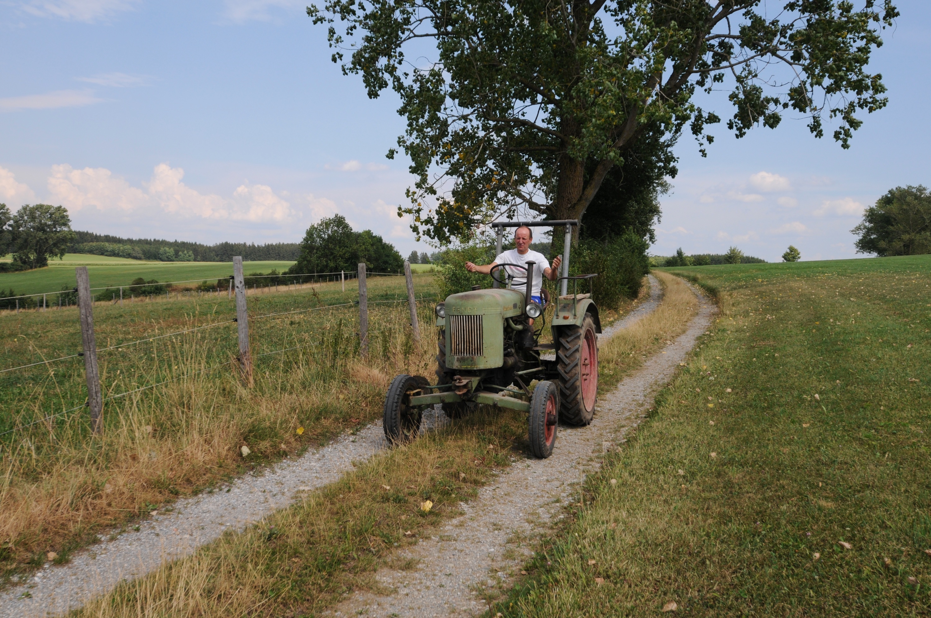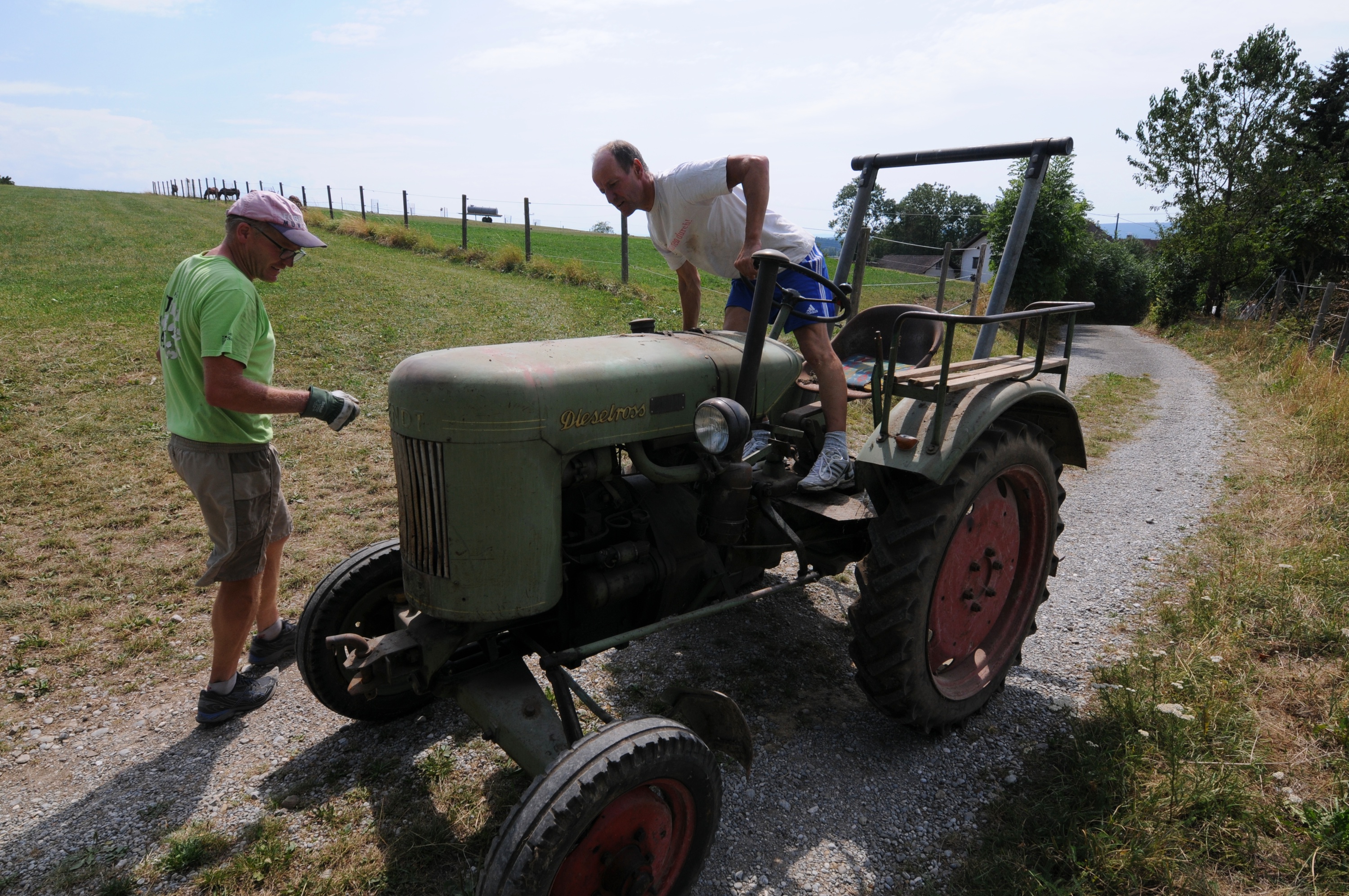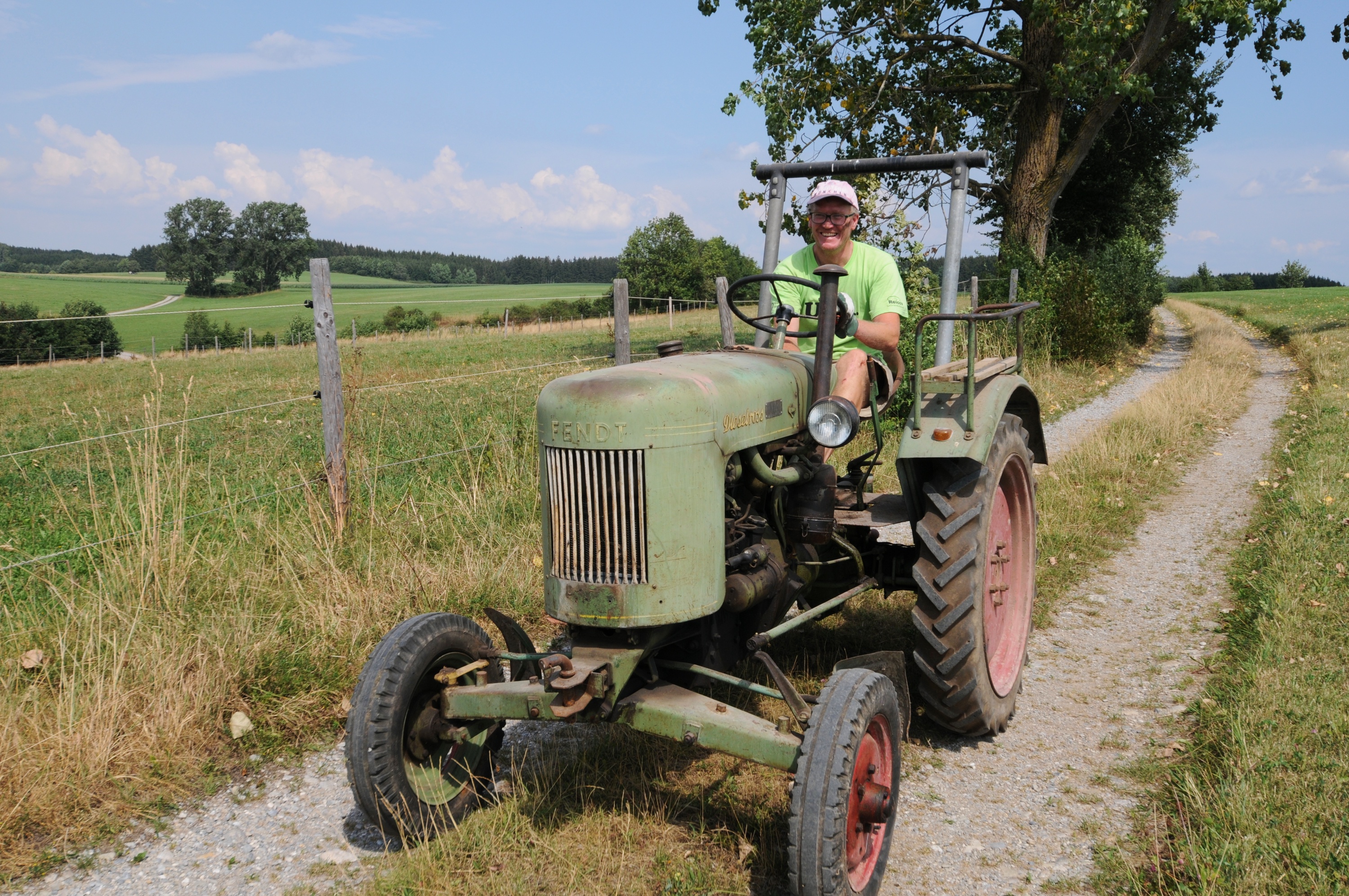 Über 30 Jahre stand es still in einer Ecke in der Tenne. Heute wurde das alte Fendt Dieselross rausgeschleppt. Die Reifen der Vorderräder wurden grob auf den Felgen ausgerichtet und aufgepumpt. Alter Dieselkraftstoff und Öl waren noch drin, also wurde der Versuch gewagt und der alte Traktor angeschleppt: Nach dem ersten Kolbenhub sprang er brav an, als wenn er nie gestanden hätte und fuhr aus eigener Kraft einmal den Hügel hinauf und wieder runter. Was für ein Erlebnis!