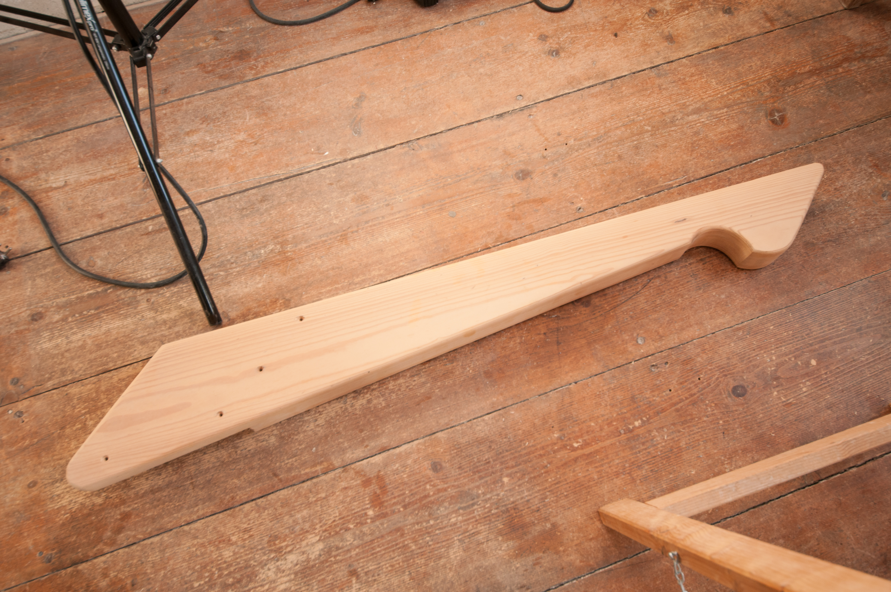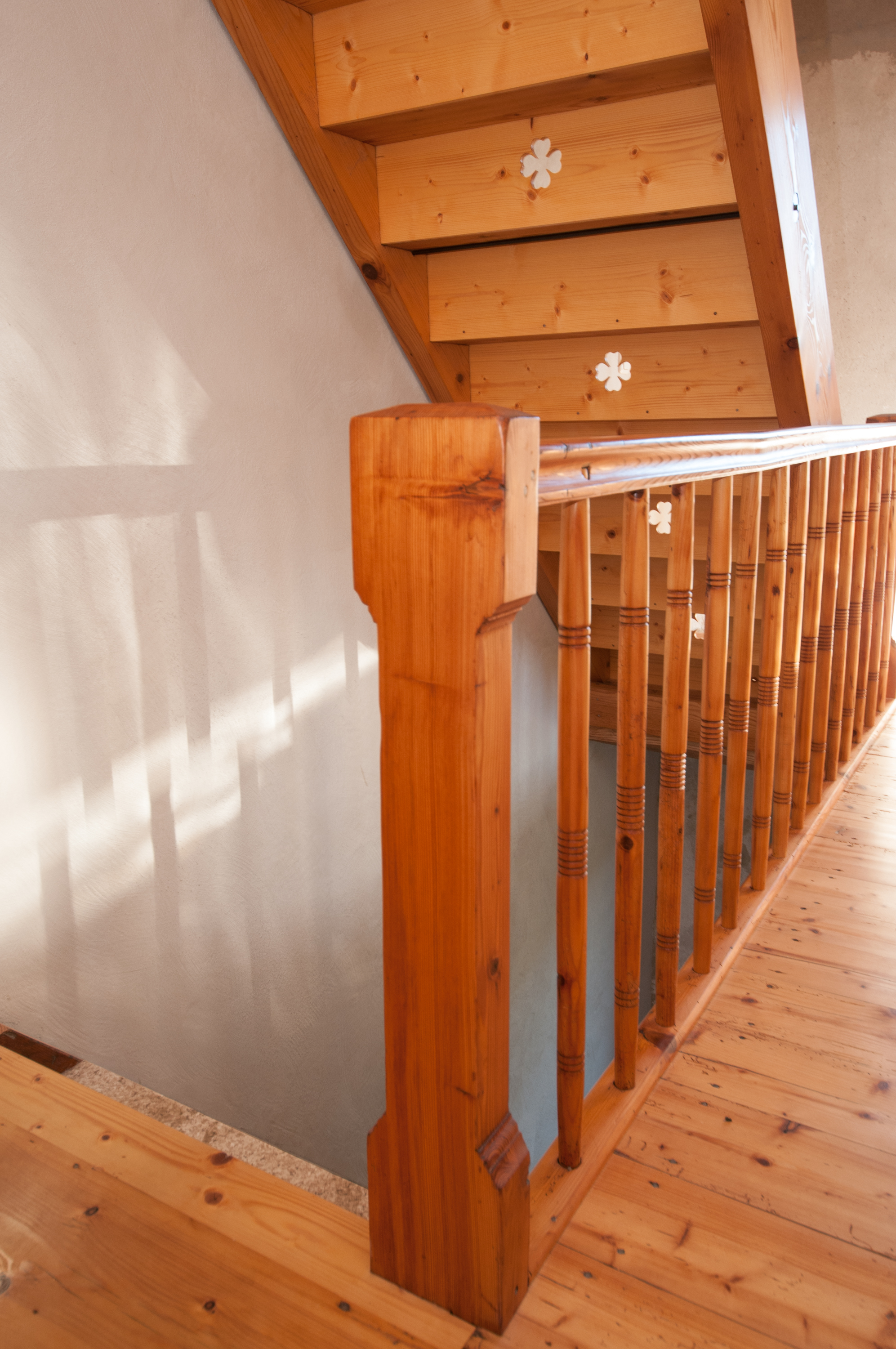 Das Treppengeländer zwischen EG und OG lag schon lange Zeit fertig geschliffen auf Lager. Den unteren Pfosten wollten wir jedoch nicht wieder einbauen, da er irgendwann einmal ersetzt wurde und weder stilecht noch schön war.Den Spuren in der Treppenwange nach zu urteilen ging der Handlauf früher einmal bis ganz nach unten. Vermutlich war es den Leuten am Treppenansatz jedoch zu eng, so dass man irgendwann beschloss, den Pfosten zwei Stufen höher in die Wange zu setzen. Dagegen spricht auch eigentlich nichts, wenn man den Pfosten optisch halbwegs passend zum Geländer gefertigt hätte. Stattdessen hat man jedoch offensichtlich zu Fertigware gegriffen, die alles andere als zeitgemäß war.