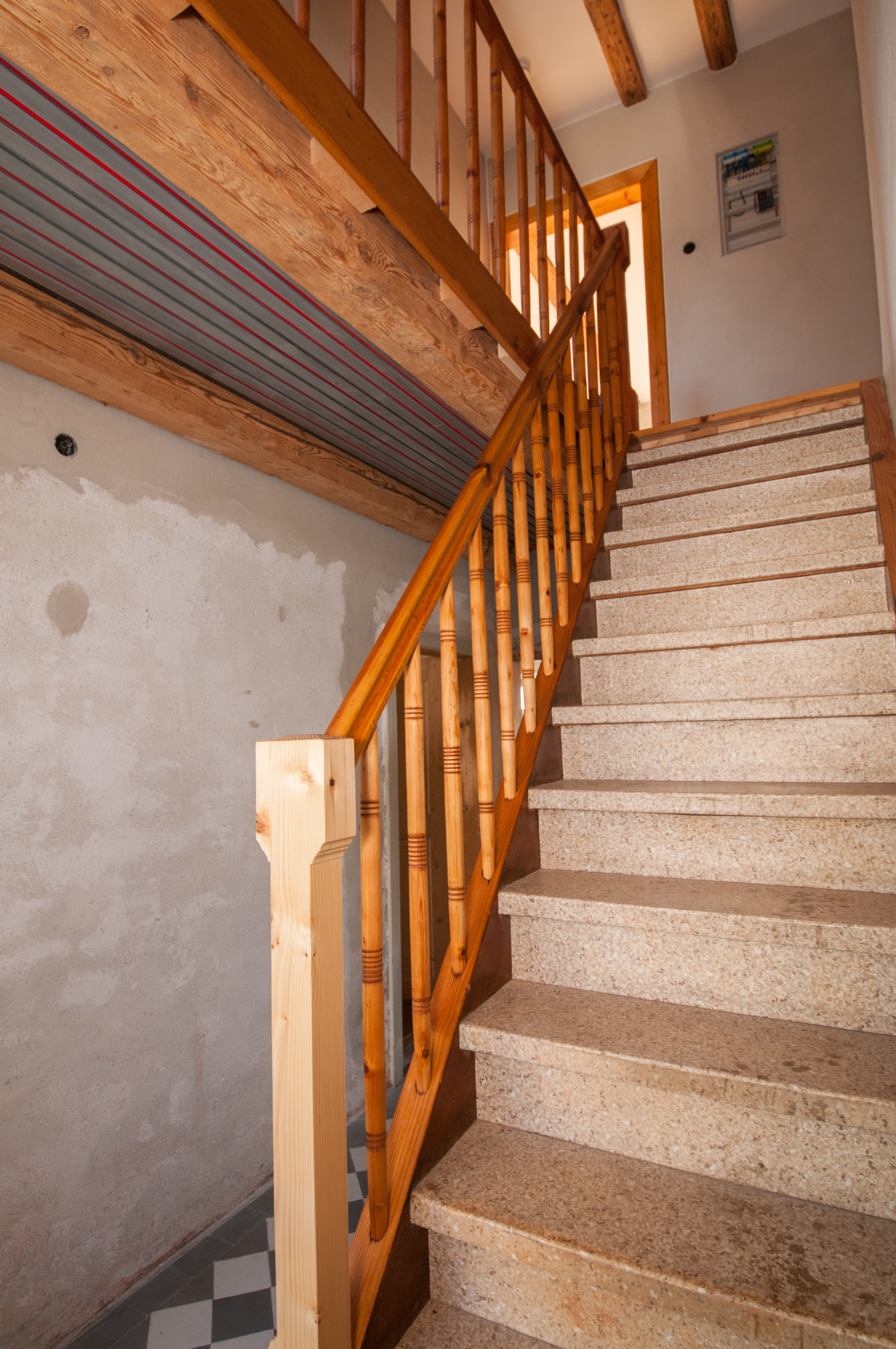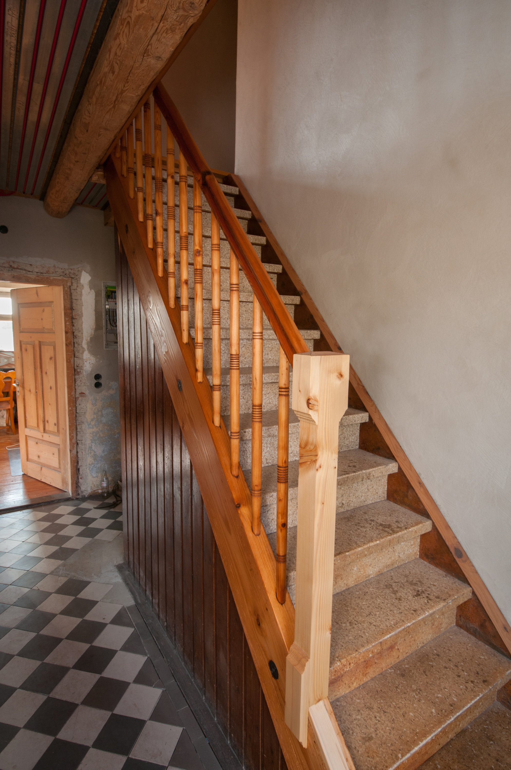 Aktuell sehen der neue Pfosten und die Flickstelle in der Wange noch erschreckend bleich im Vergleich zum restlichen Geländer aus, doch das wird sich in ein bis zwei Jahren schon stark angeglichen haben. Irgendwann werde die Stufen auch noch restauriert. Das wird aber erst der Fall sein, wenn die Sanierungsarbeiten im Erdgeschoss weitgehend abgeschlossen sind. Bis dahin ist der PVC-Belag auf den Stufen ganz nützlich, um den Dreck bis oben abzulaufen.