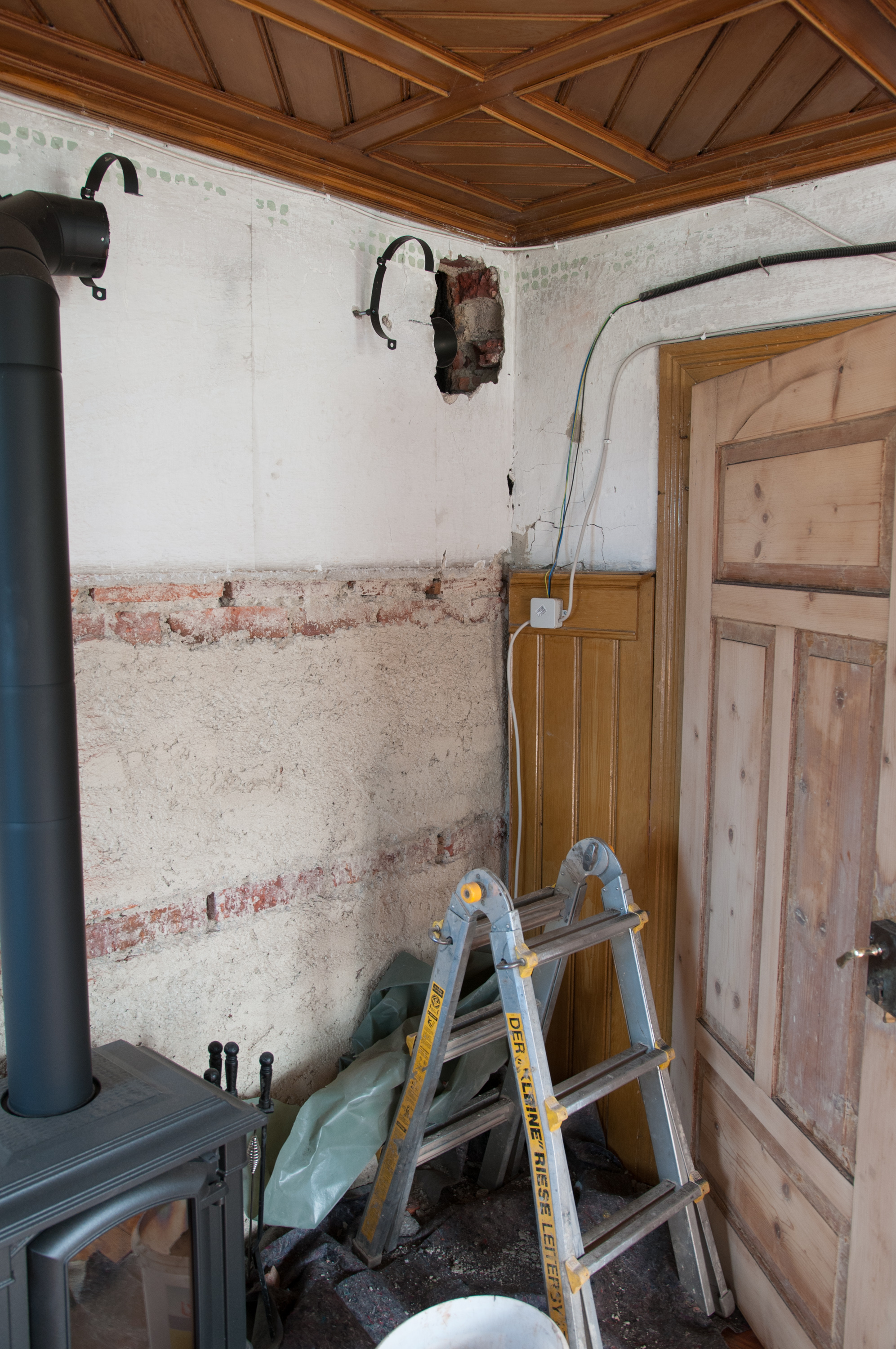 Da im ersten Stock Deckenbalken direkt am Schornstein verlaufen, war eine der Auflagen des Kaminkehrers, dass wir ein VA-Rohr in den Schornstein einziehen lassen. Auch wenn die Balken bereits seit über 100 Jahren so verbaut waren, wären sie im Fall eines Schornsteinbrands stark gefährdet. Normalerweise muss ein Schornsteinbrand nicht gefährlich sein, doch hier wäre das definitiv der Fall gewesen.