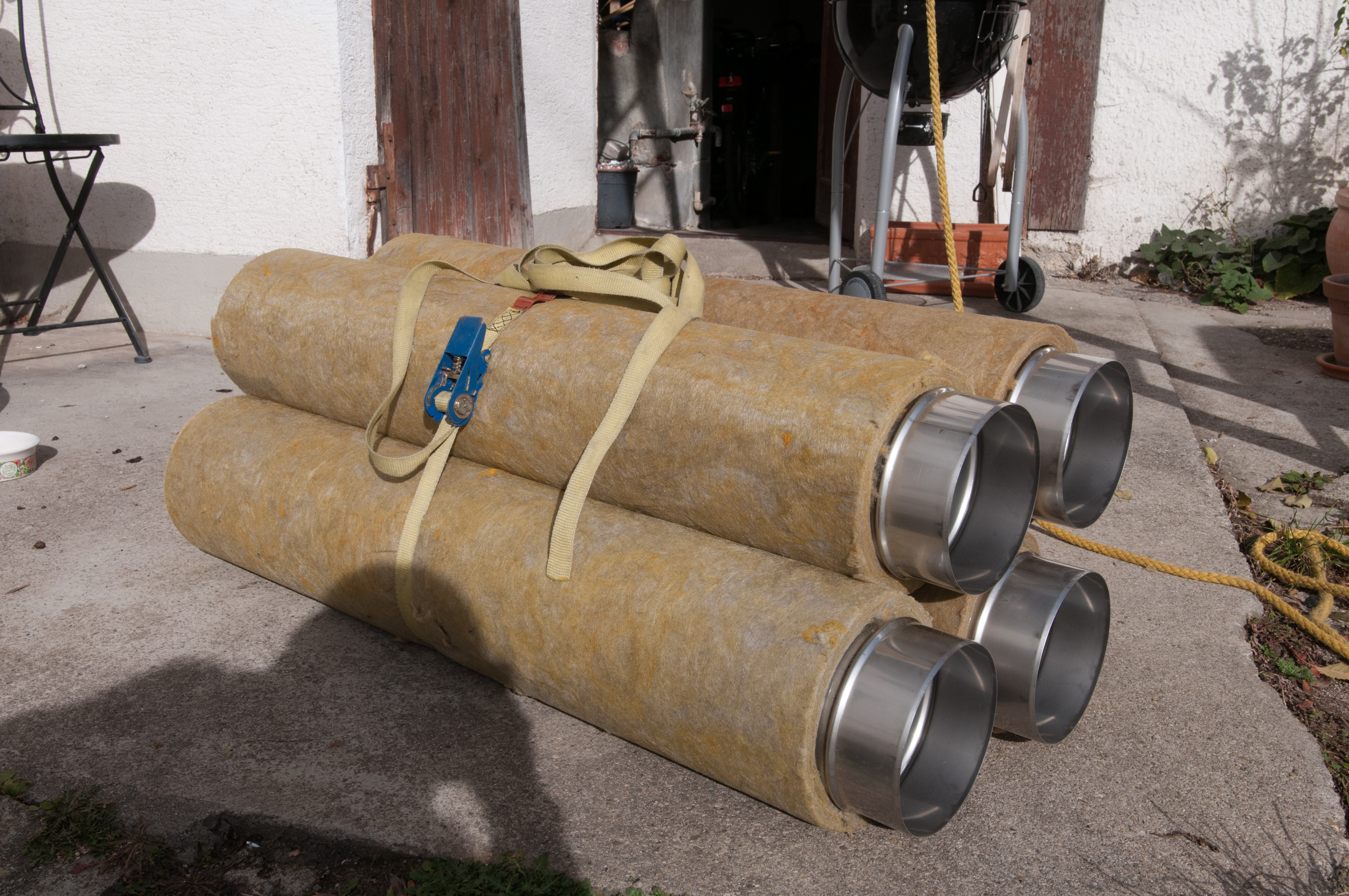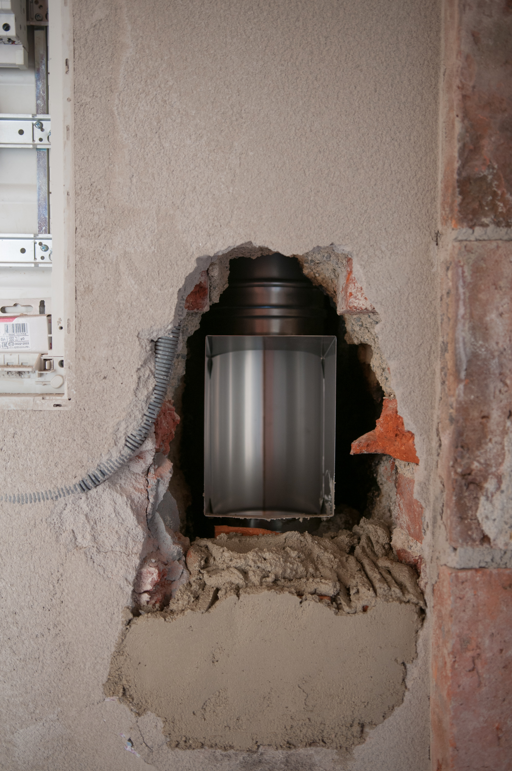 Die restlichen Arbeiten gingen zum Glück ohne weitere Zwischenfälle vonstatten. Die Betonplatte, mit der der Schornstein abgedeckt ist, musste zur Durchführung der Rohre durchbohrt werden. Da die Platte mit Stahl armiert wurde, hat der Kerl auf dem Dach ordentlich Arbeit mit dem Loch gehabt. Da die Abzweige als ziemlich große T-Stücke ausgeführt waren, mussten entsprechend große Löcher in den Schornstein gestemmt werden, die nachher wieder zugemauert wurden.