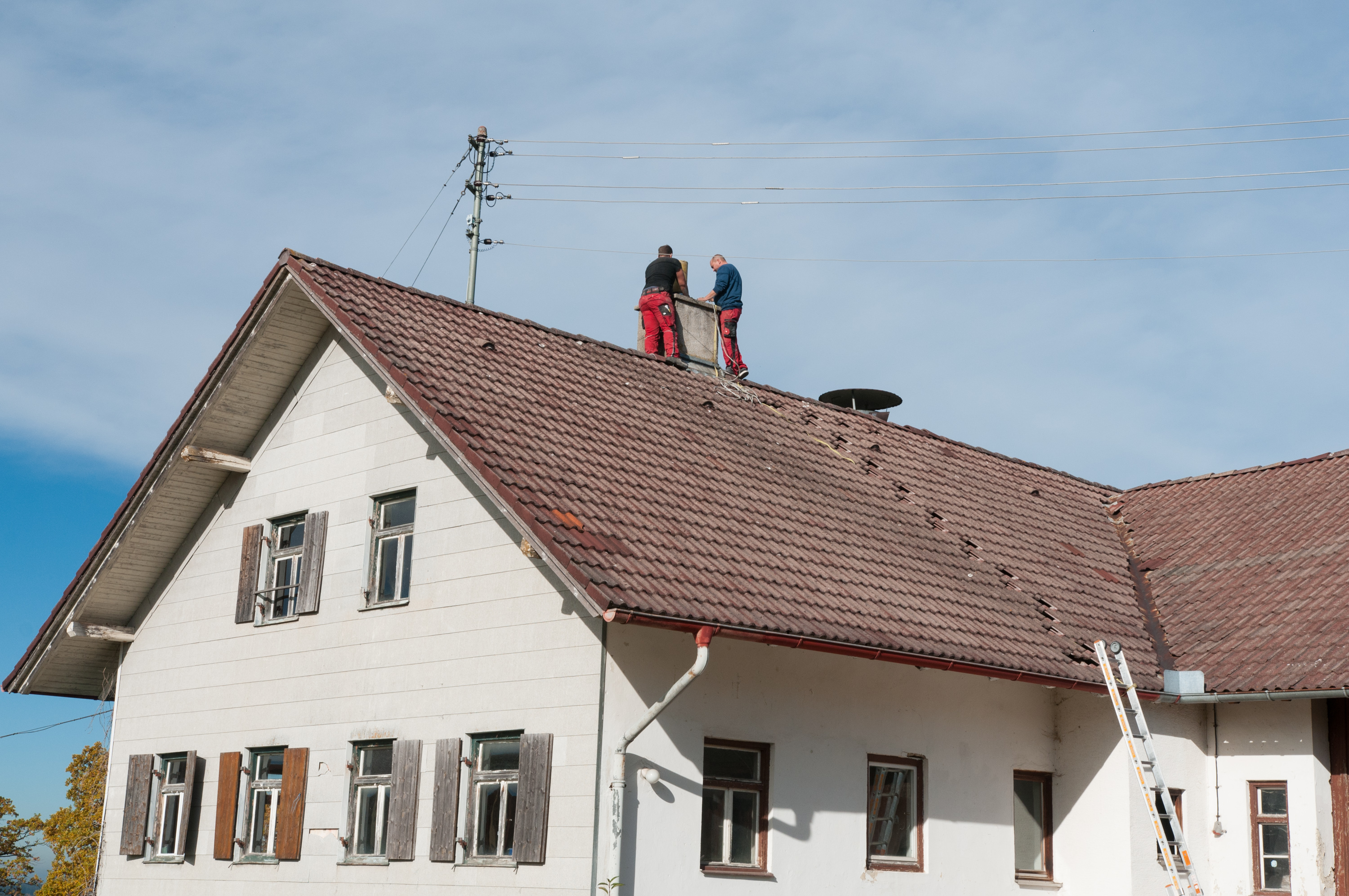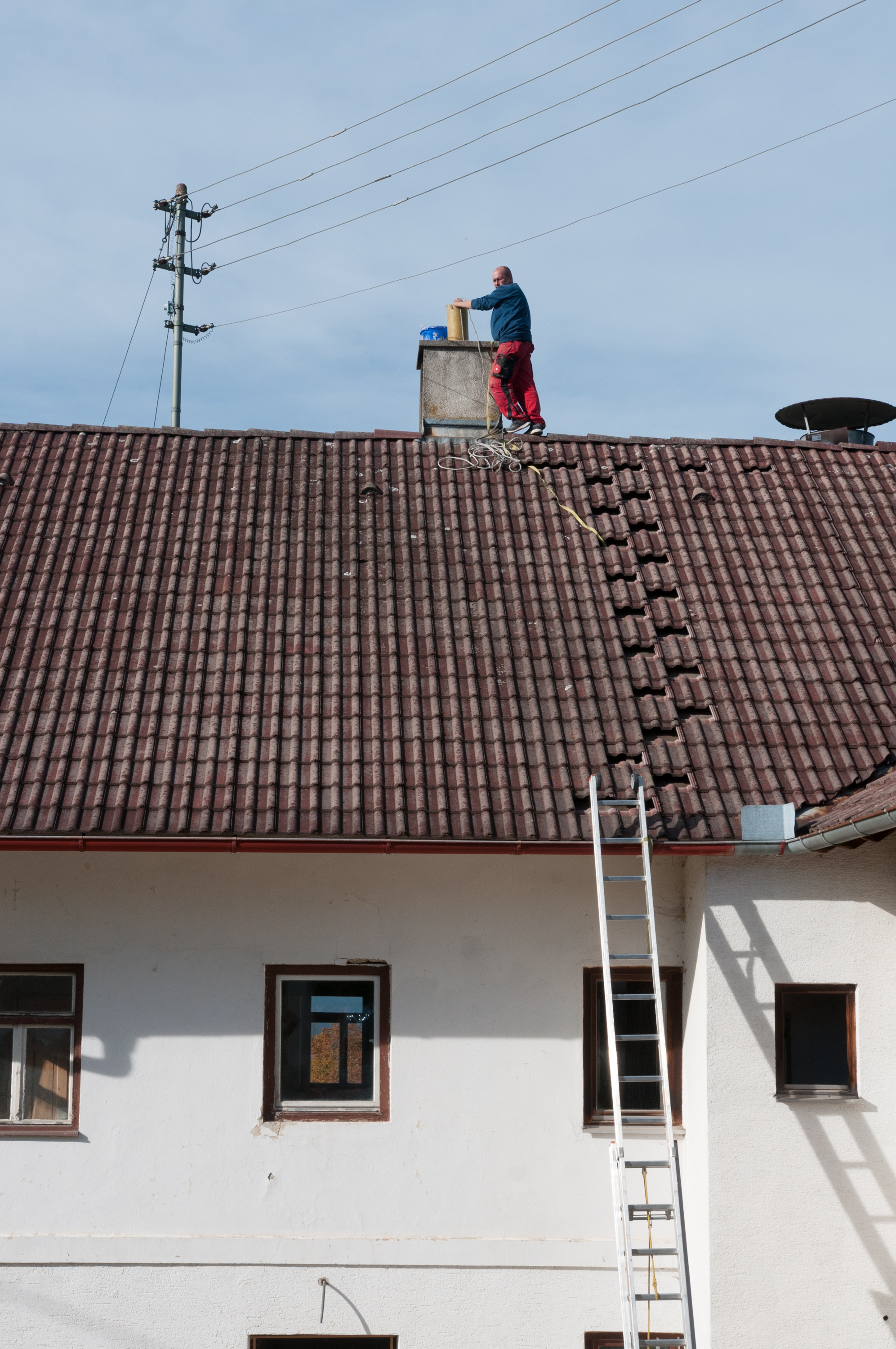 Daher haben wir vor einigen Wochen einen Schornsteinbauer mit der Sanierung beauftragt. Da ich eh von zu Hause aus arbeite und daher meistens vor Ort bin, haben wir uns darauf geeinigt, dass er den Auftrag auch kurzfristig ausführen kann, wenn ein Termin frei wird. Eigentlich hatten wir dieses Jahr nicht mehr mit der Ausführung gerechnet, da die Arbeiten ein halbwegs brauchbares Wetter zum Besteigen des Dachs voraussetzen, doch gestern kam unerwartet ein Anruf, dass man heute kommen wolle.