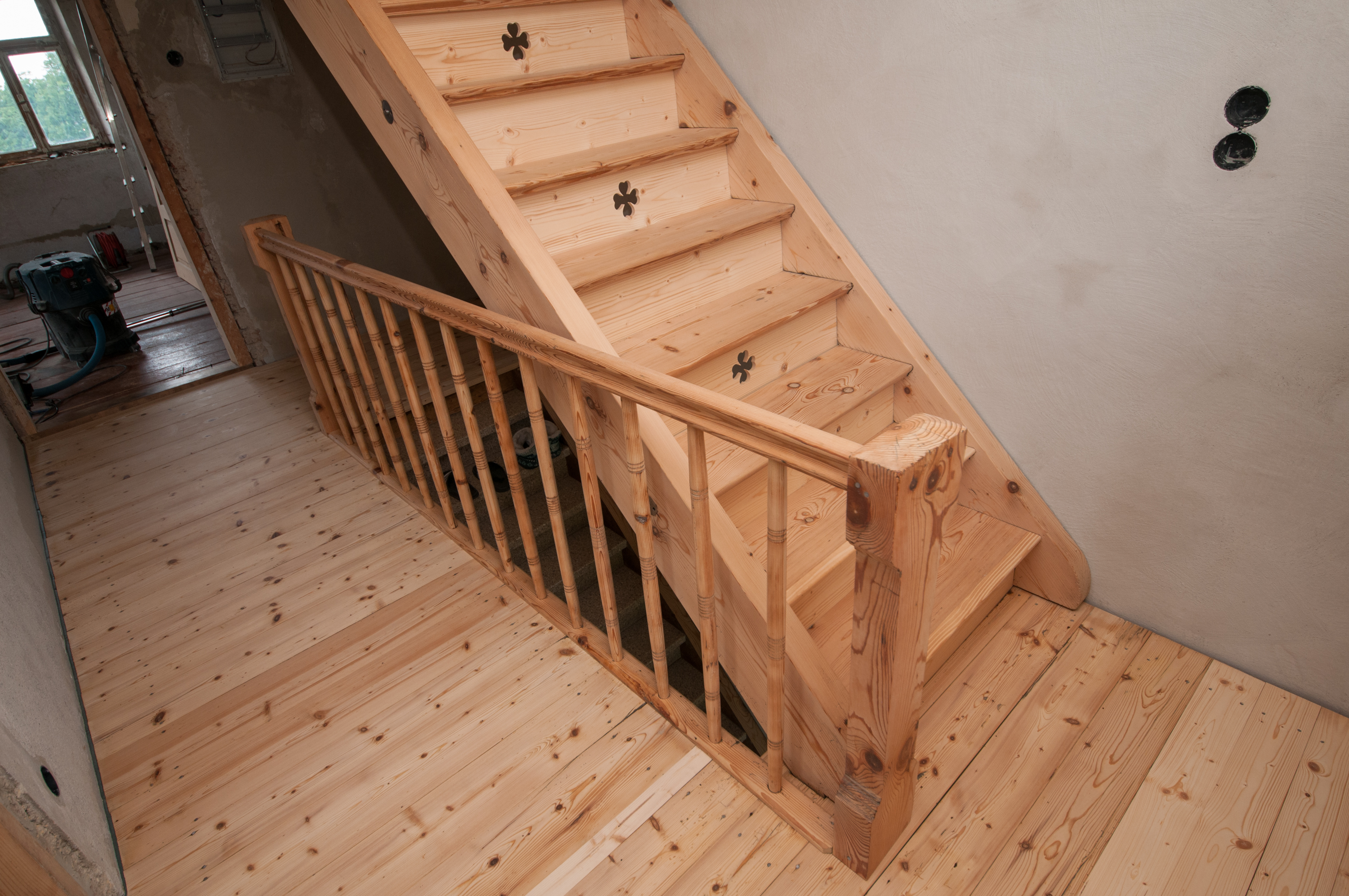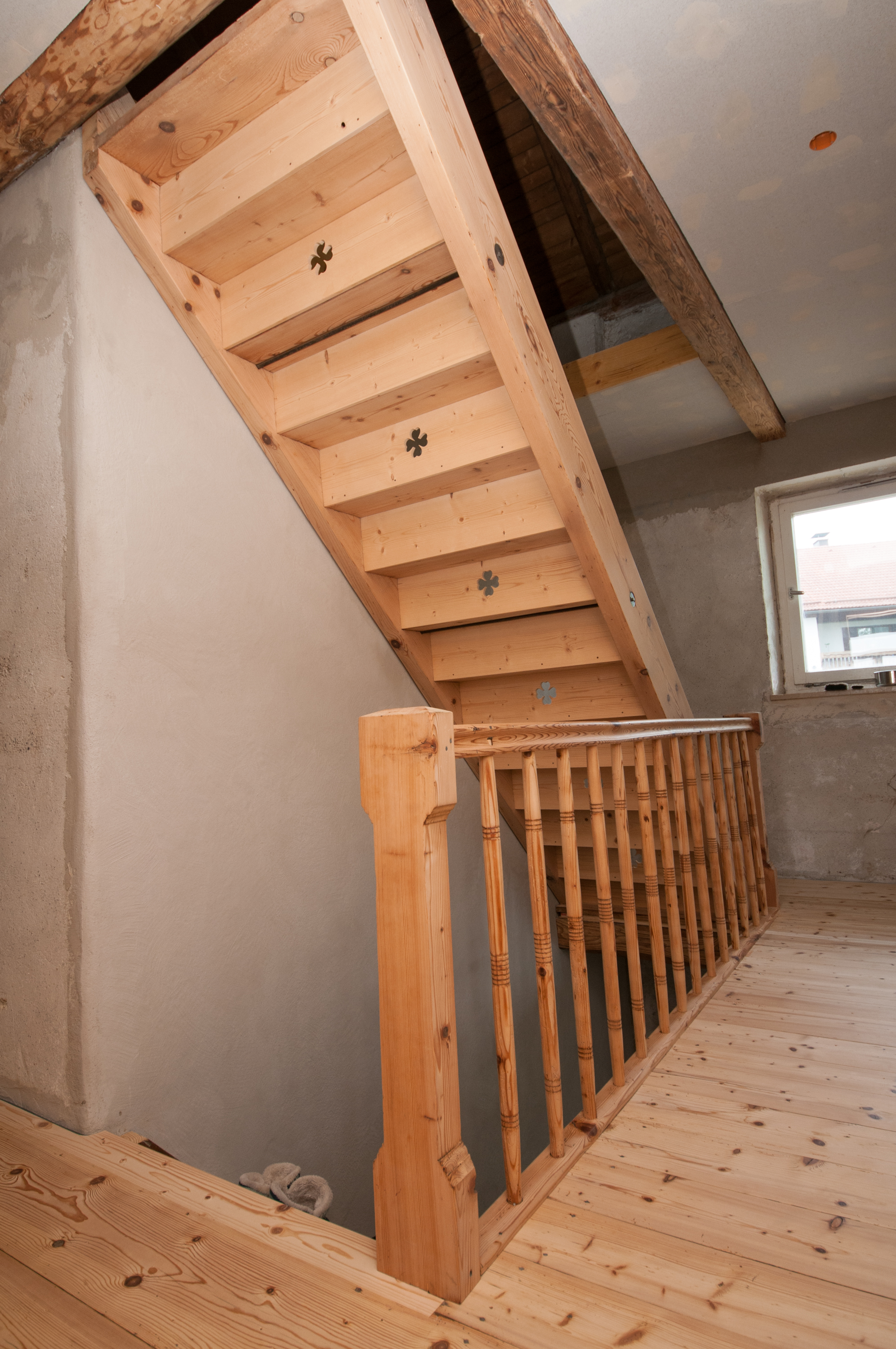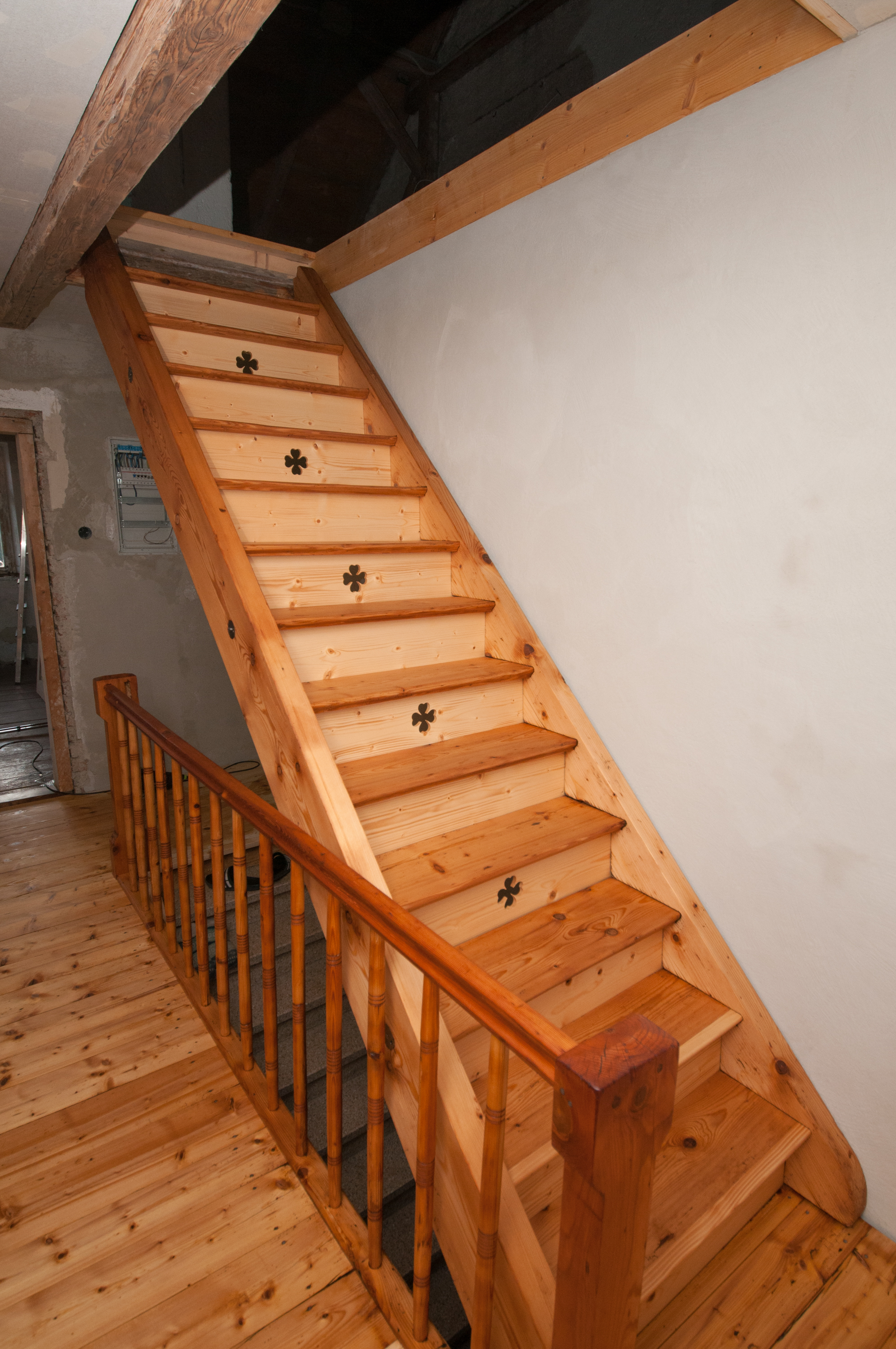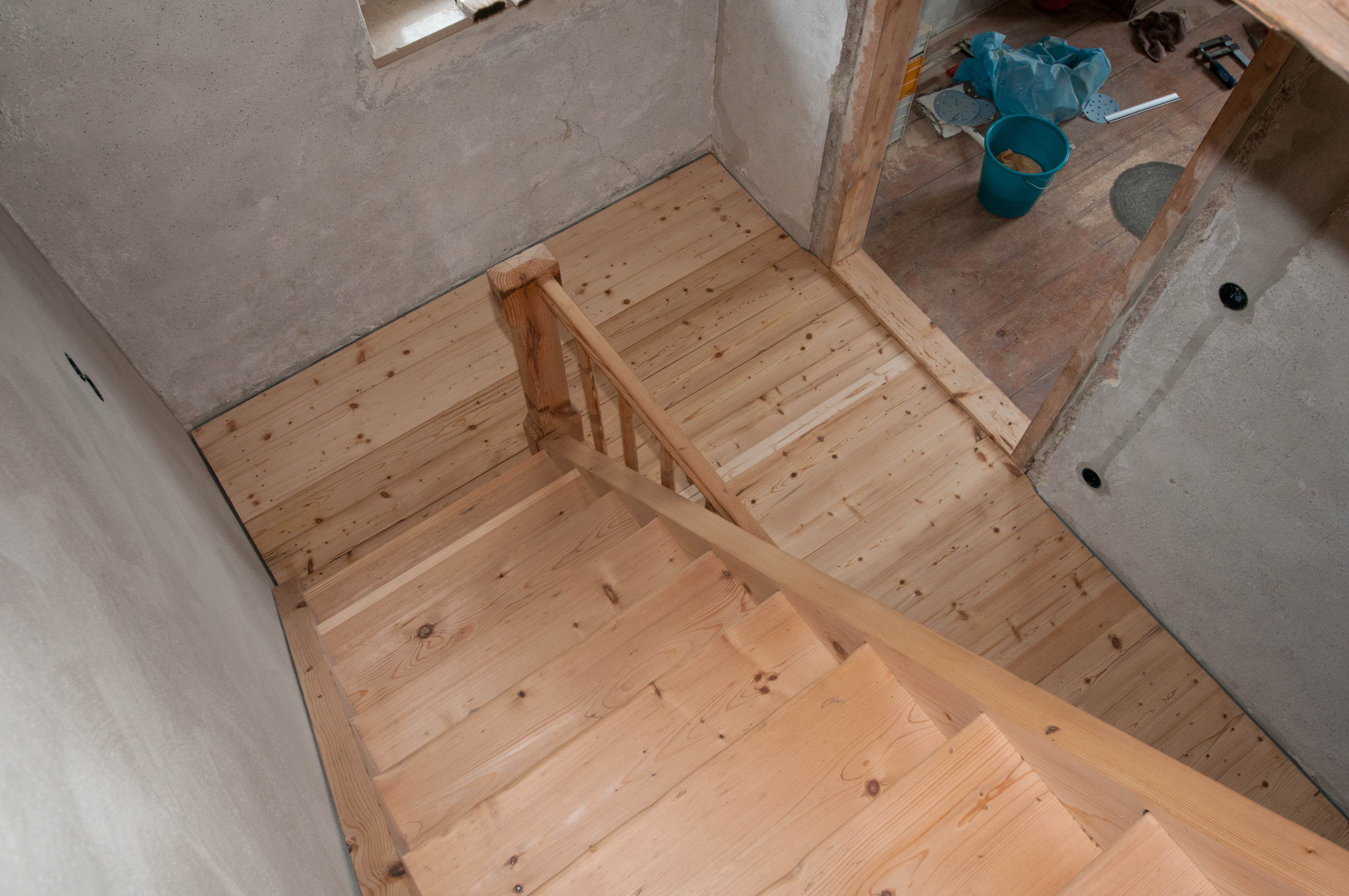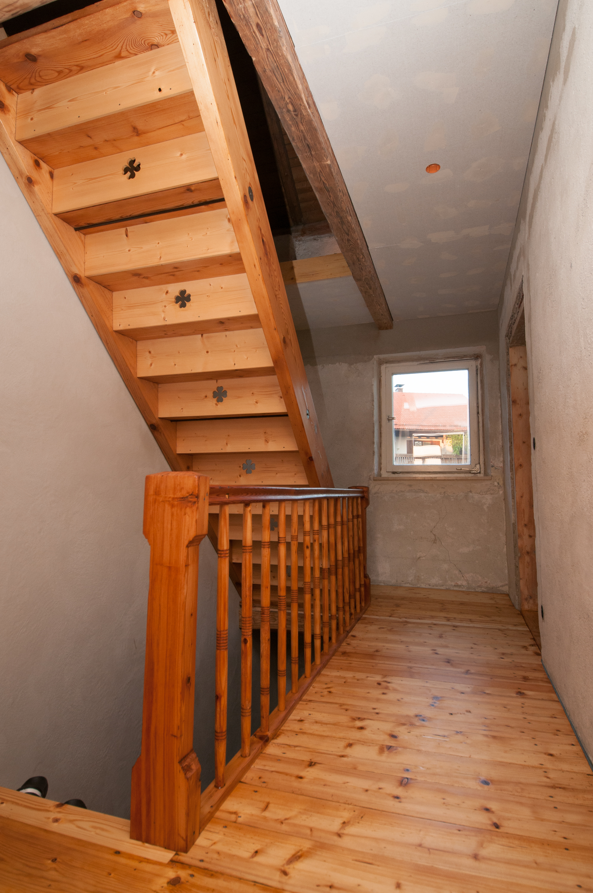 Die Anhebung des Bodens im ersten Stock hat in der Tat noch zu einem weiteren Vorteil verholfen: Zuvor war die letzte Treppenstufe zum Dachboden ganze 6 Zentimeter zu hoch, während die letzte Stufe zum ersten Stock 5 Zentimeter zu flach war. Nun sind diese Stufen deutlich näher an der normalen Stufenhöhe.