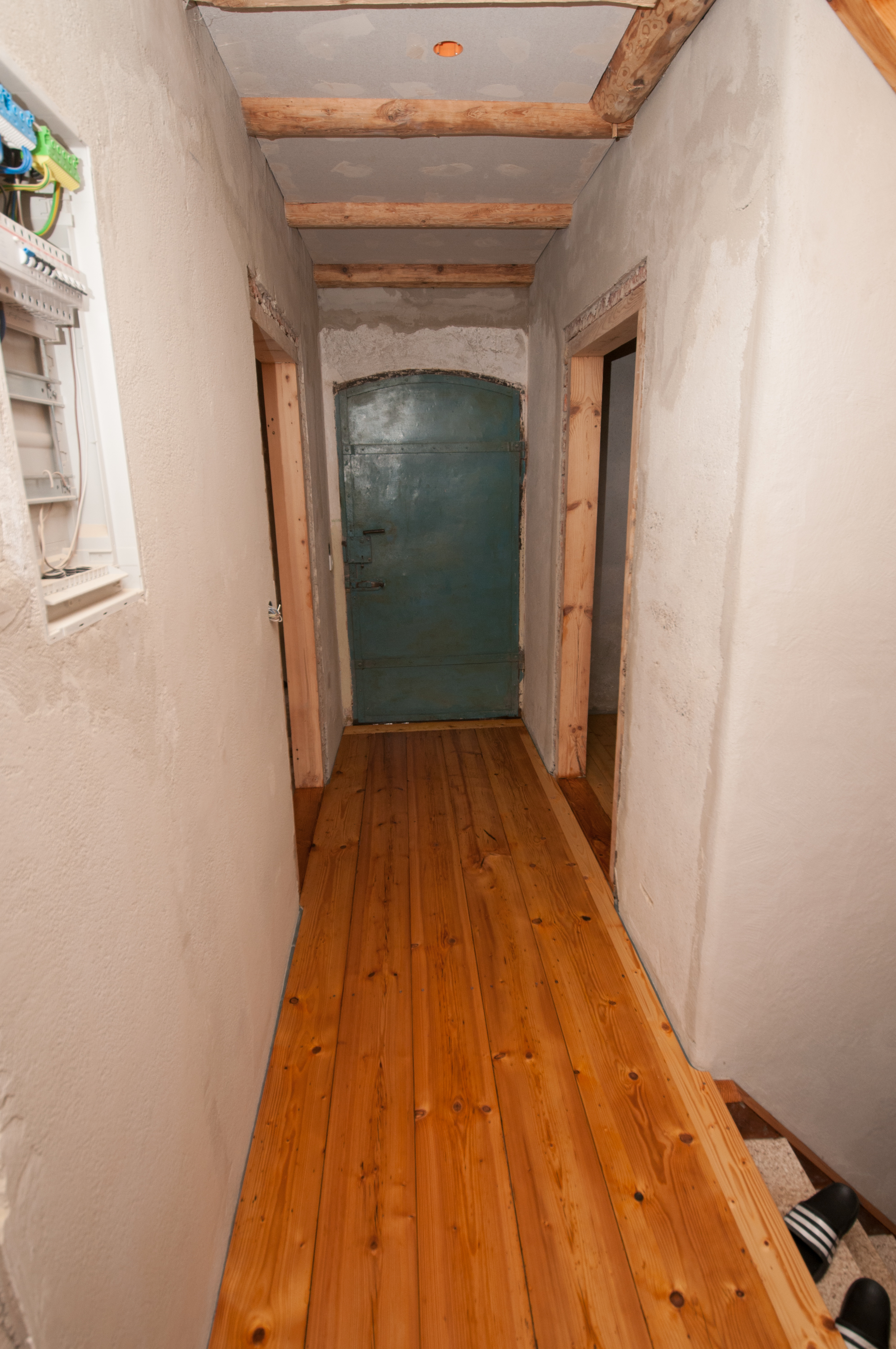 Sollten alte Dielen, die ihre Spuren des Alters in Würde tragen dürfen, absolut plan sein? Nein, das finde ich nicht. Das könnte jetzt eine Ausrede sein, weil ich gar nicht wüsste, wie ich mit einer Walzenschleifmaschine den schmalen Flur mit diagonalen Fahrten plan schleifen sollte, doch ich finde, solch ein alter Boden darf gar nicht zu präzise geplant sein.Solange sie keine hervorstehenden Kanten haben, dürfen alte Dielen gerne leicht wellig sein. Astlöcher dürfen gerne in Form kleine Wölbungen spürbar sein. Und Dielenböden dürfen knarzen. Schließlich macht das den Flair eines alten Hauses aus.