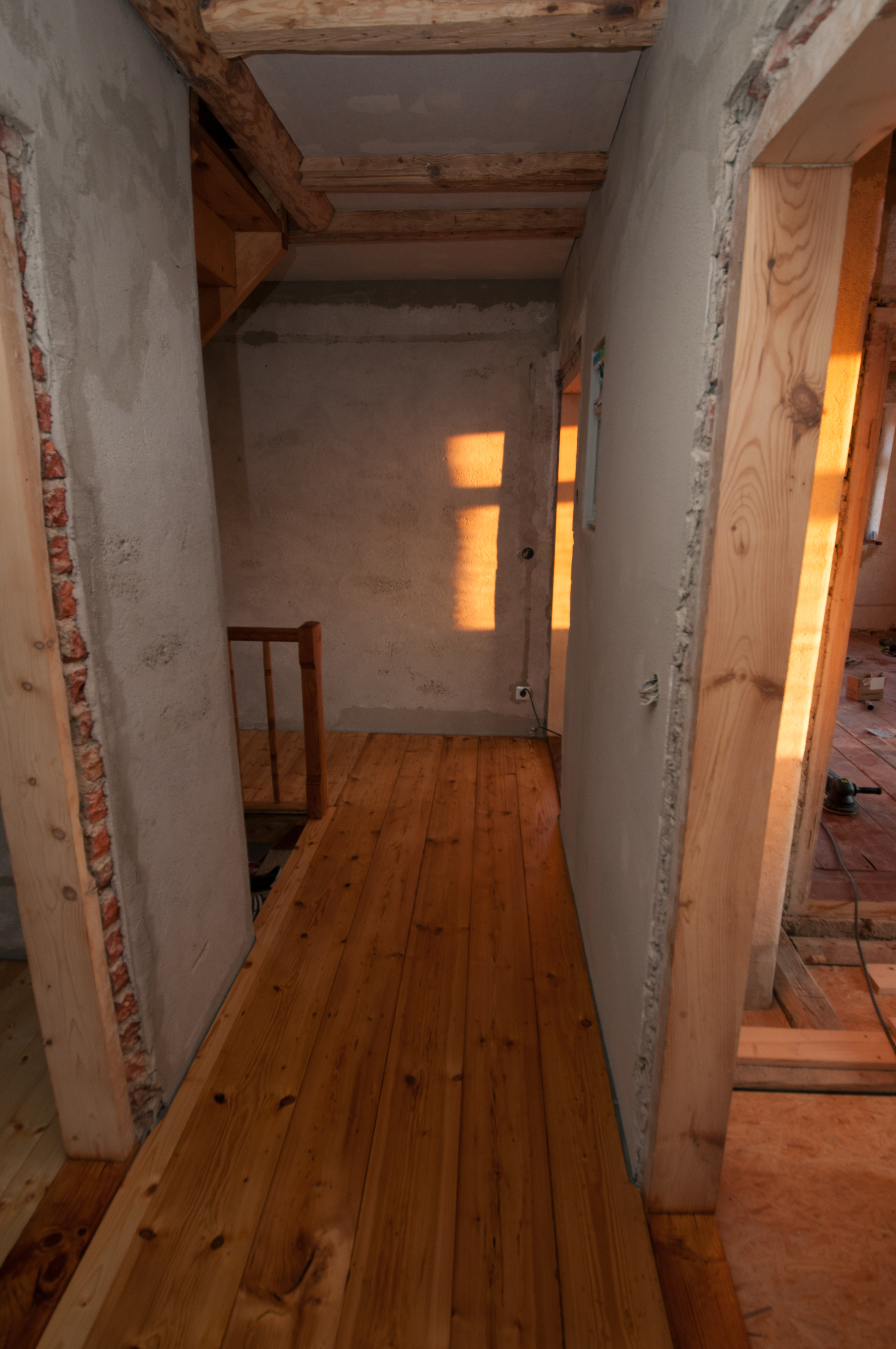 Nun wurden wir auch endlich für die letzten Wochen harter Arbeit entlohnt: Der Anblick der geölten Treppe und der Dielen ist kaum in Worten zu beschreiben. Es sieht einfach unglaublich schön aus. Die neuen Stücke im Dielenboden fallen nun zwar umso stärker auf, doch auch das ist bei einem alten Haus nicht verwerflich. Früher wurde auch mit dem Material ausgebessert, das man gerade zur Hand hatte.
