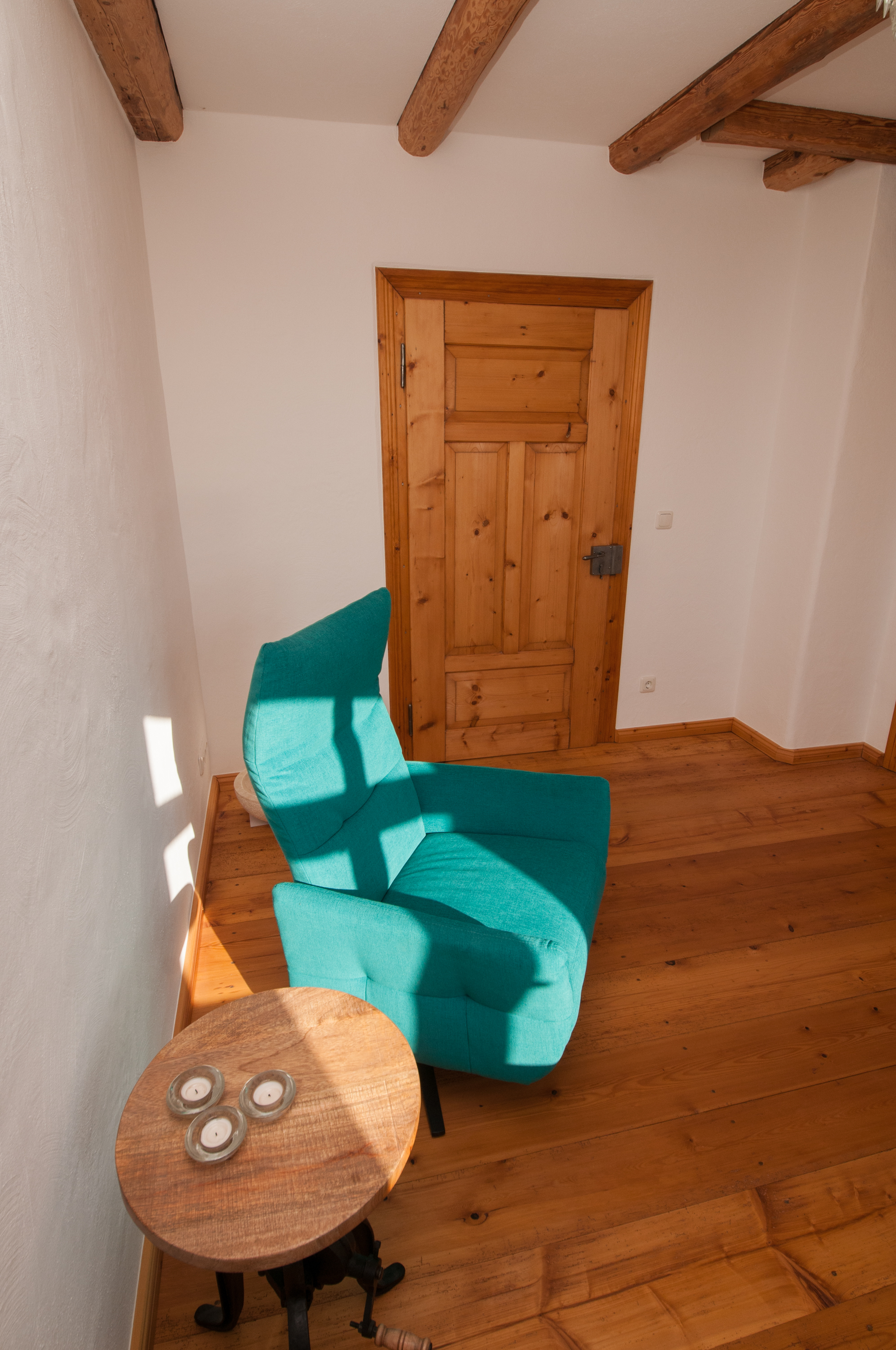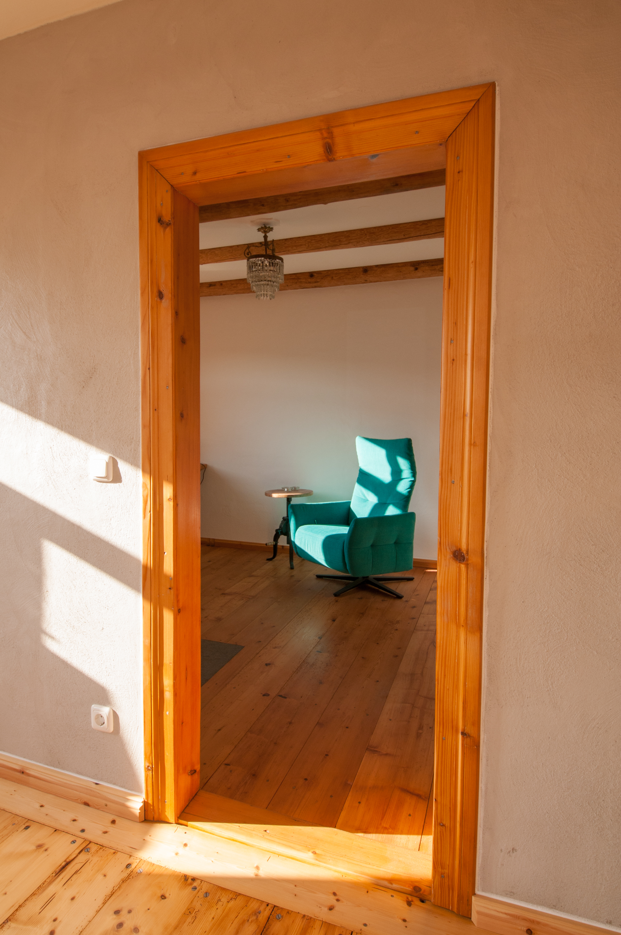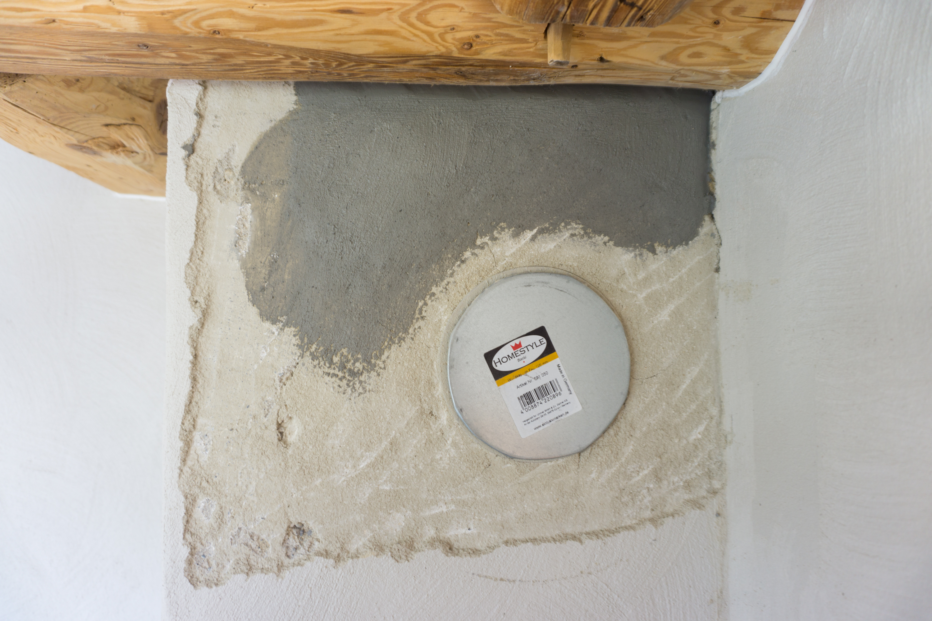 Den Putz auszubessern, ging besser als erwartet. Durch das Verstreichen lassen sich die Übergänge später nicht einmal mehr erahnen. Zur Sicherheit wurde dieses Mal in dem Bereich noch ein Gitter mit eingeputzt. Danach waren nur noch wenige Kleinigkeiten zu erledigen. Die Dosen in der Decke haben ihre Deckel gekriegt, die Decke wurde mit Streichputz strukturiert und alle Anschlüsse zwischen Decke und Wand wurden mit Strukturacryl abgefugt.