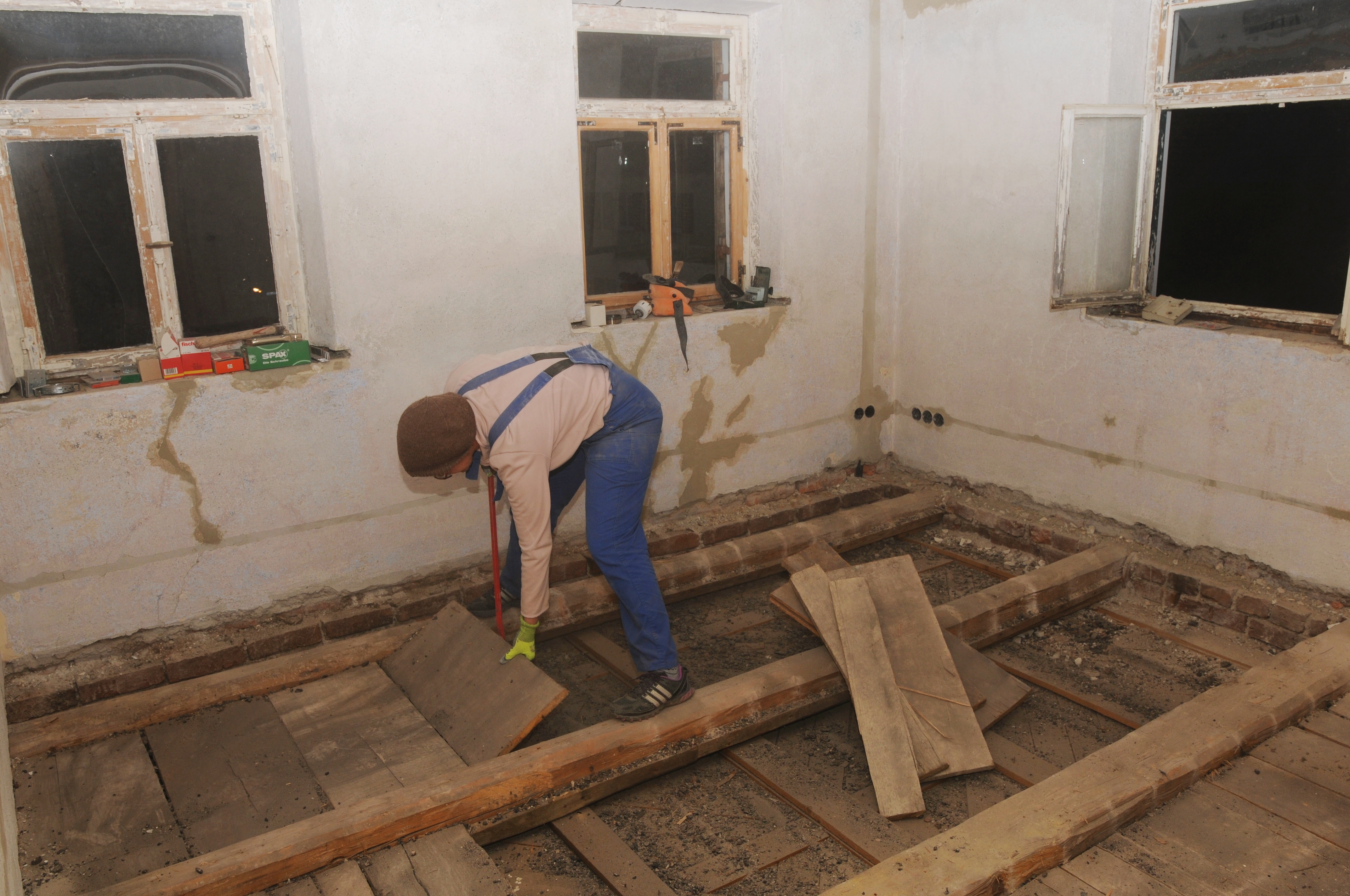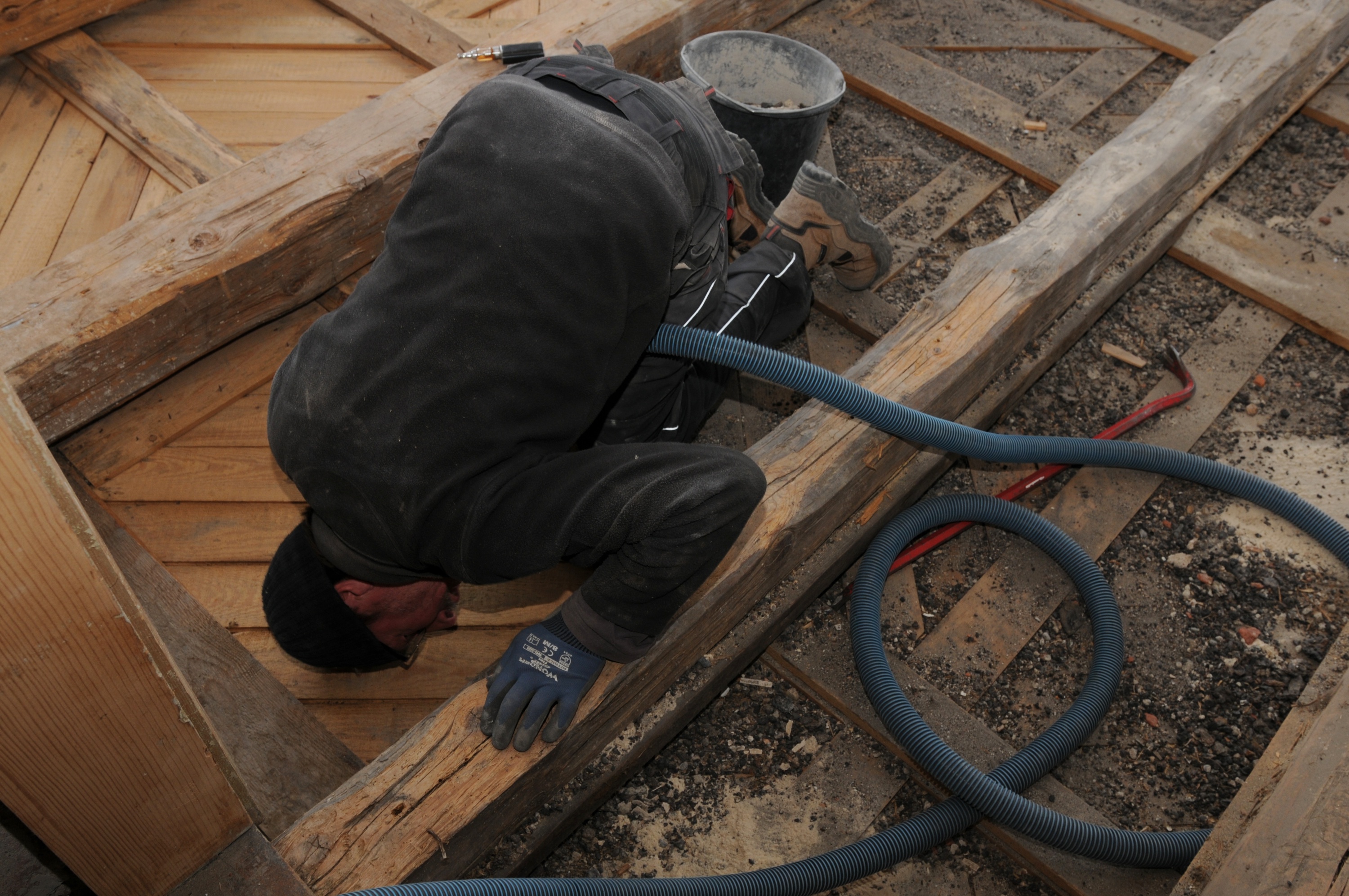 Jeden Abend werden da oben auf der Holzdecke fleißig Schlackebrocken durch die Gegend geschoben. Das macht einen höllischen Lärm und geht spätestens dann ordentlich auf den Keks, wenn man schlafen will. Also wird der Sanierungsplan wieder einmal abgeändert und die Öffnung des Dielenbodens im Schlafzimmer vorgezogen, denn eins steht fest: Entweder die Mäuse oder die Schüttung müssen raus. Da wir es für schwieriger halten, die Mäuse kurzfristig hinauszuwerfen, hat die Schüttung verloren.