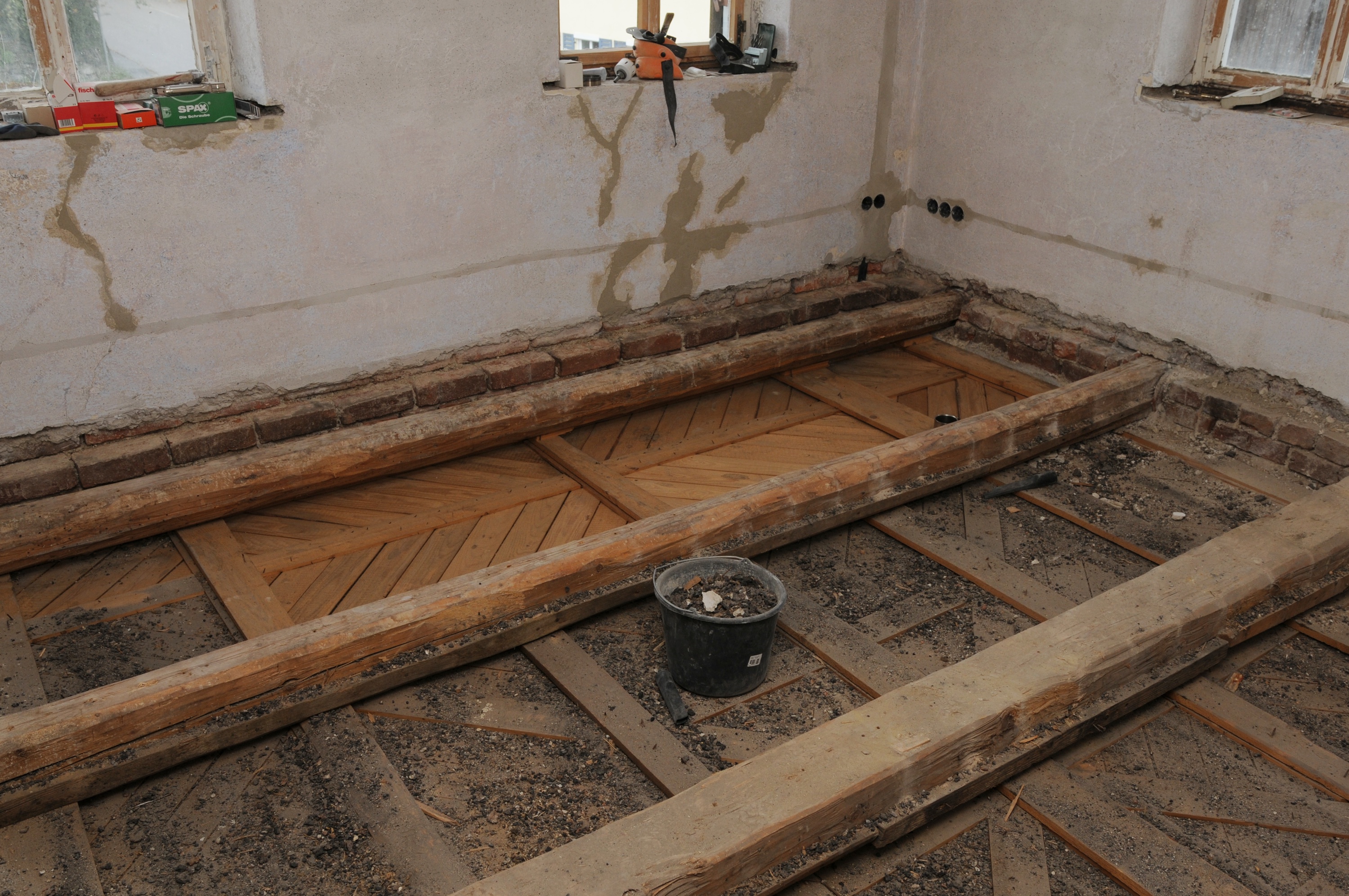 Bei dieser Decke zeigt sich mal wieder die ganze Sparsamkeit der Bauern, die das Haus damals gebaut haben: Auf den Einschüben waren kaum 4 Zentimeter Schlacke aufgebracht, wovon ein Großteil bereits durch die Spalten zwischen den Einschüben auf die Holzdecke gerieselt ist. Dazu muss man sagen, dass dies überhaupt der einzige Raum ist, wo zwischen Erdgeschoss und erstem Stock eine Schüttung eingebracht wurde. Die anderen Böden sind einfach leer.