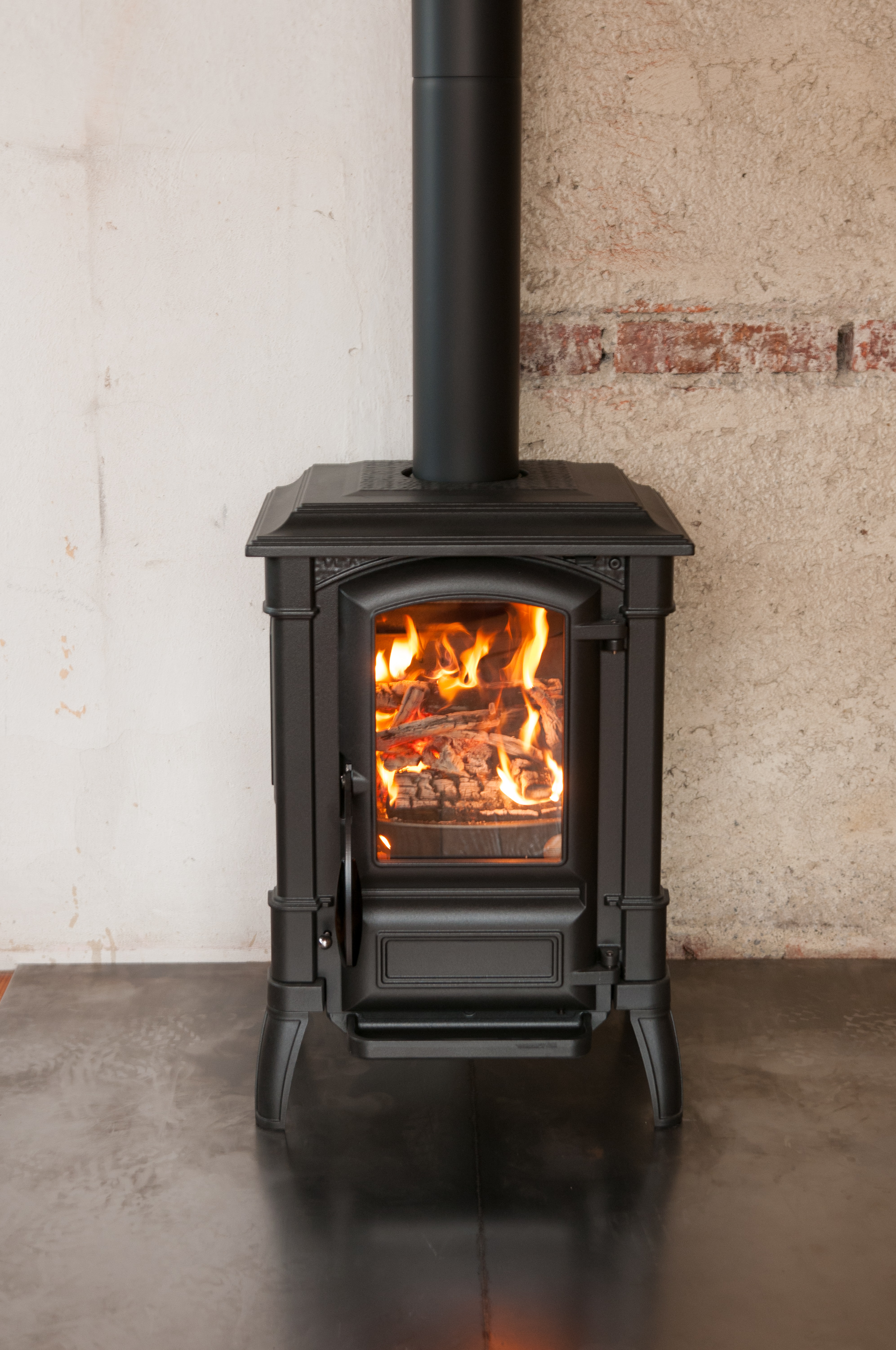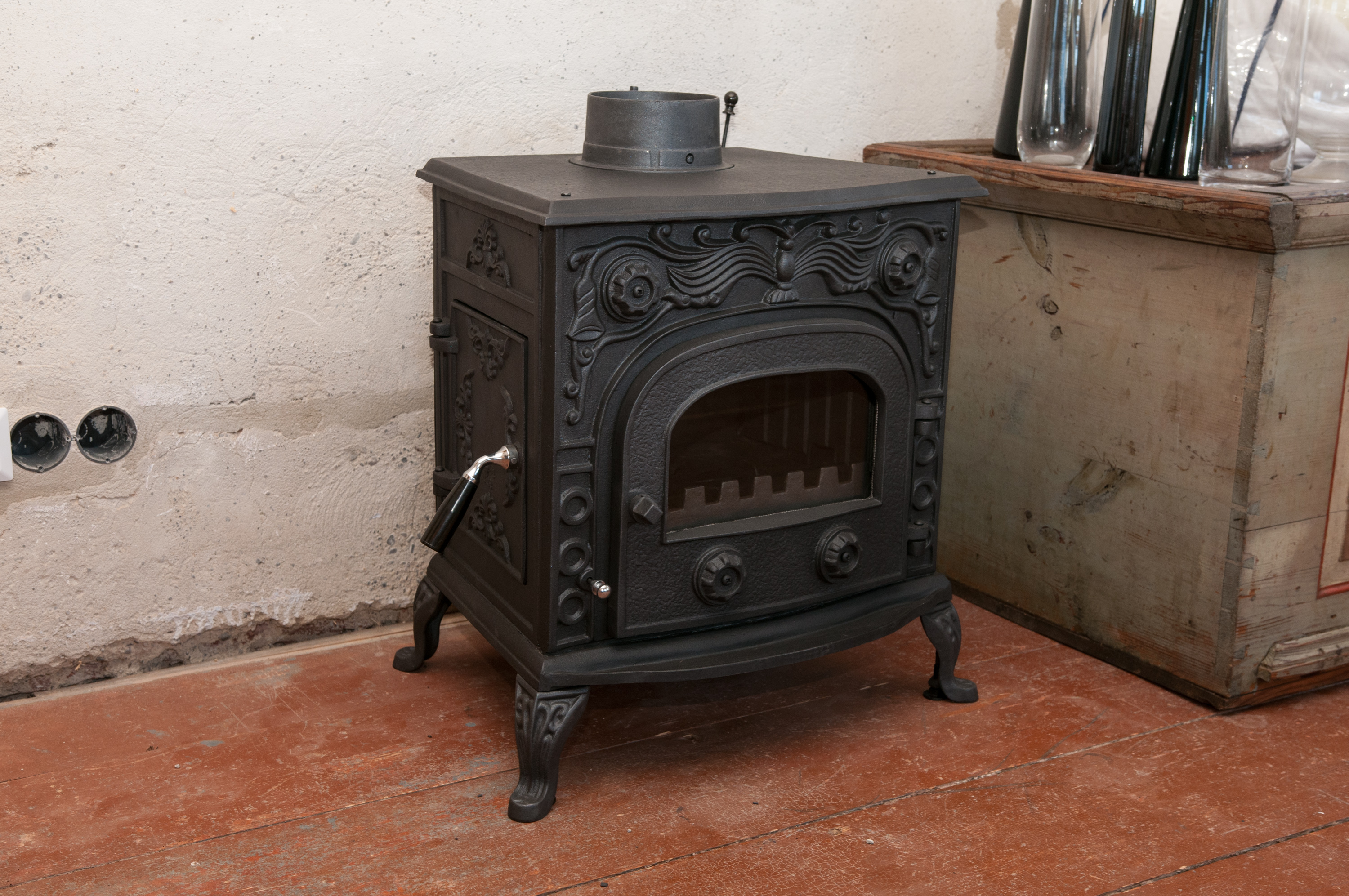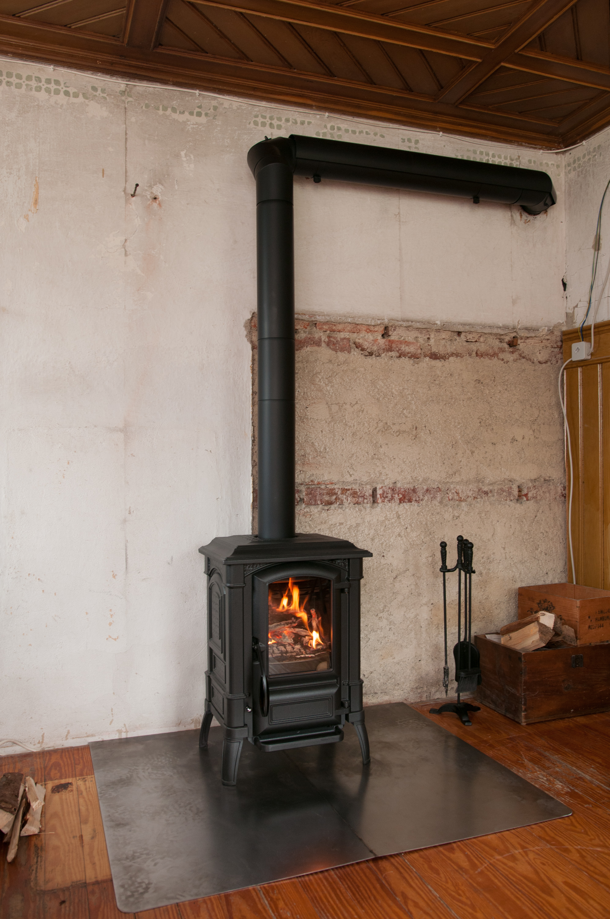 Im Sommer hatten wir beschlossen, dieses Jahr noch neue Kaminöfen anzuschaffen. Der Hauptgrund war, dass der alte Ofen selbst dicke Buchescheite in weniger als 20 Minuten verschlingt und die Kosten für einen neuen Ofen vermutlich nach weniger als 2 Heizperioden wieder eingespart sind. Die Suche erwies sich als gar nicht so leicht. Es gibt hunderte von Öfen in der angepeilten Leistungsklasse um 6kW, doch 90 Prozent davon sind einfach nur langweilig runde Zylinder und die restlichen sind größtenteils irgendwelche Pseudo-Designerstücke.Eine große Speichermasse wollten wir gar nicht, da hier tagsüber oftmals nicht geheizt wird, es Abends jedoch schnell warm werden und zur Schlafenszeit auch möglichst schnell wieder ein paar Grad kühler werden sollte. Auch später, wenn wir eine Heizung haben, ist eine kürzere Reaktionszeit nicht von Nachteil. Also haben wir nach gusseisernen Öfen gesucht, die nach Möglichkeit so aussehen, als hätten sie hier schon immer gestanden.