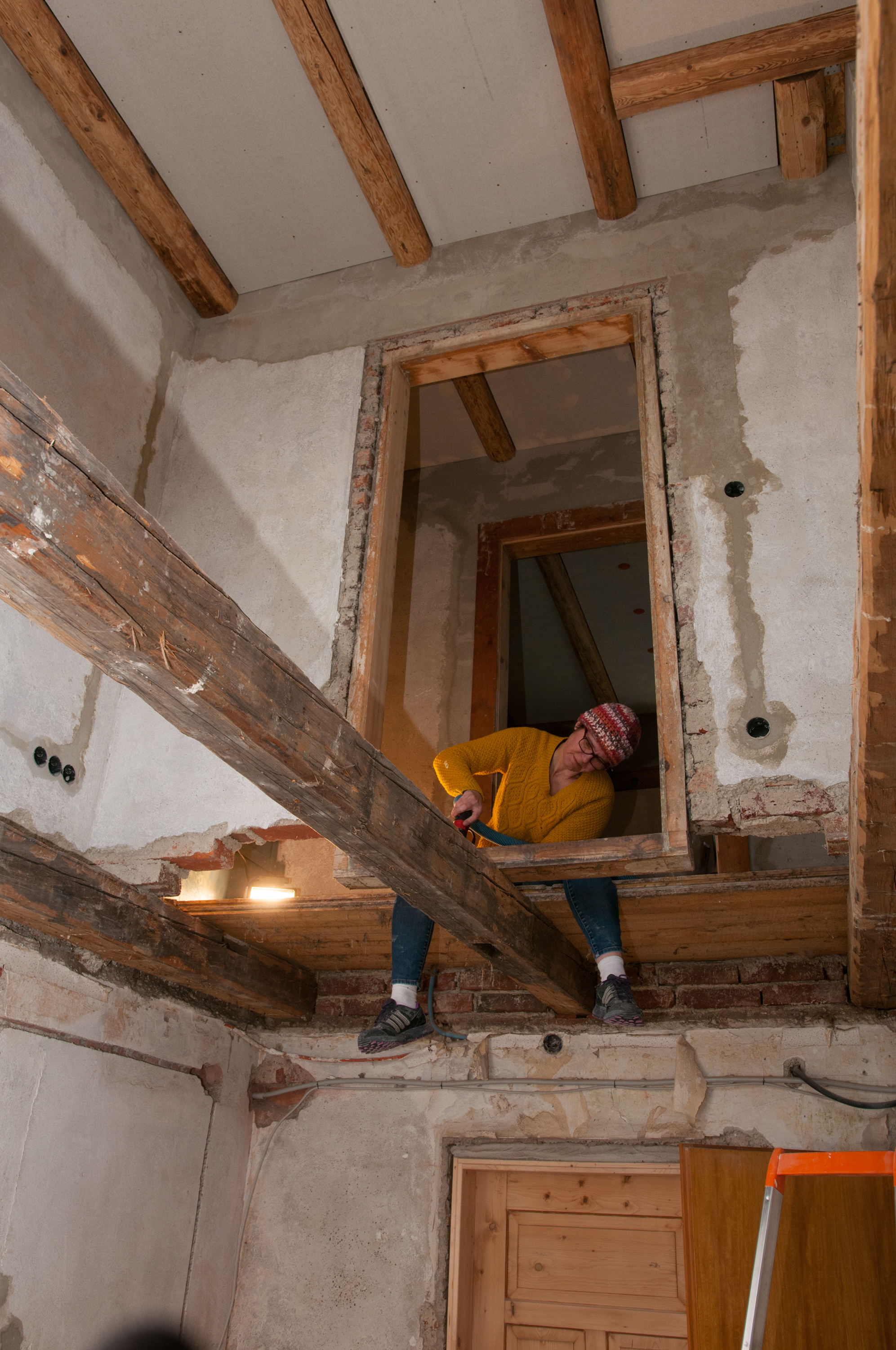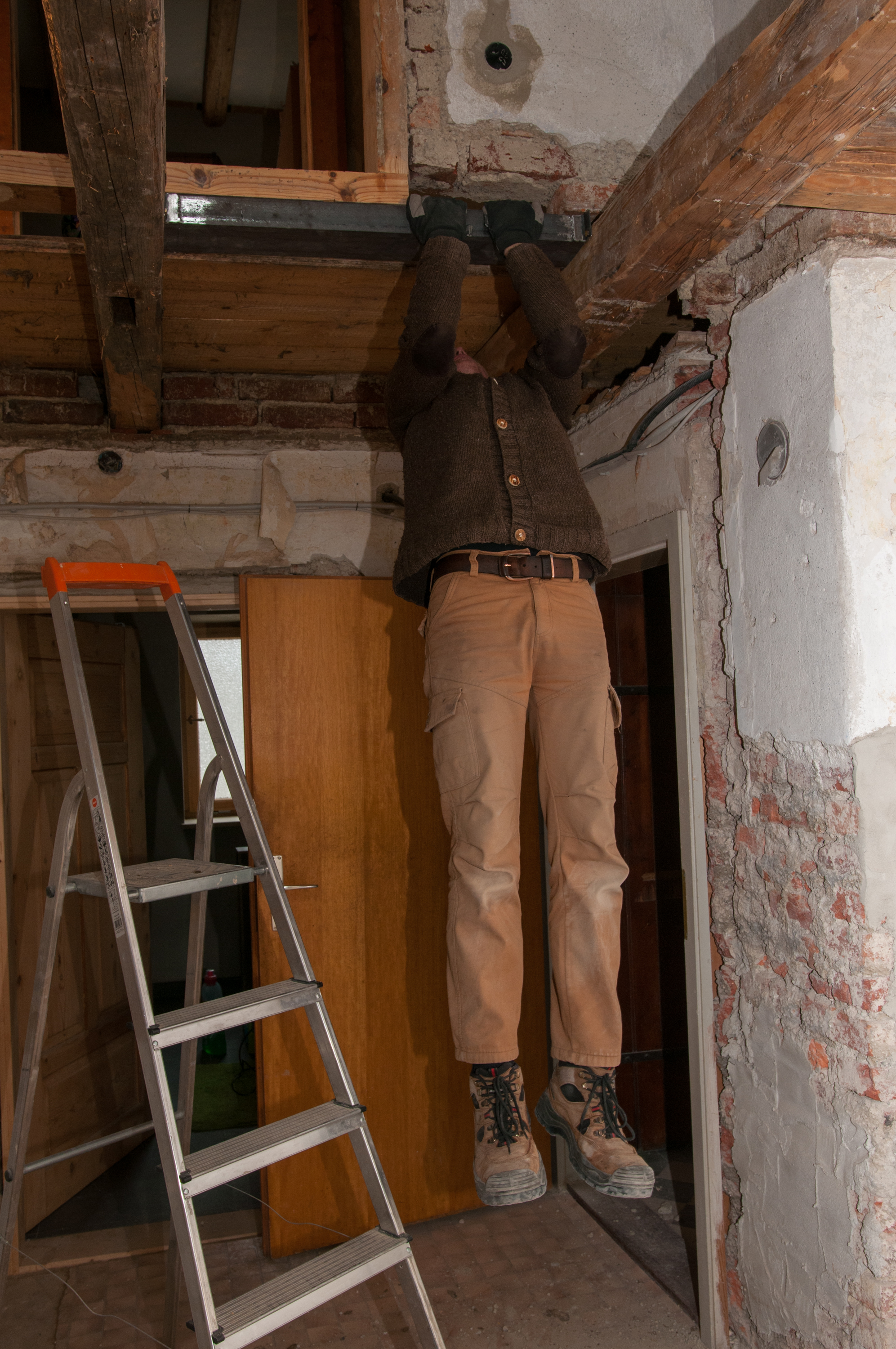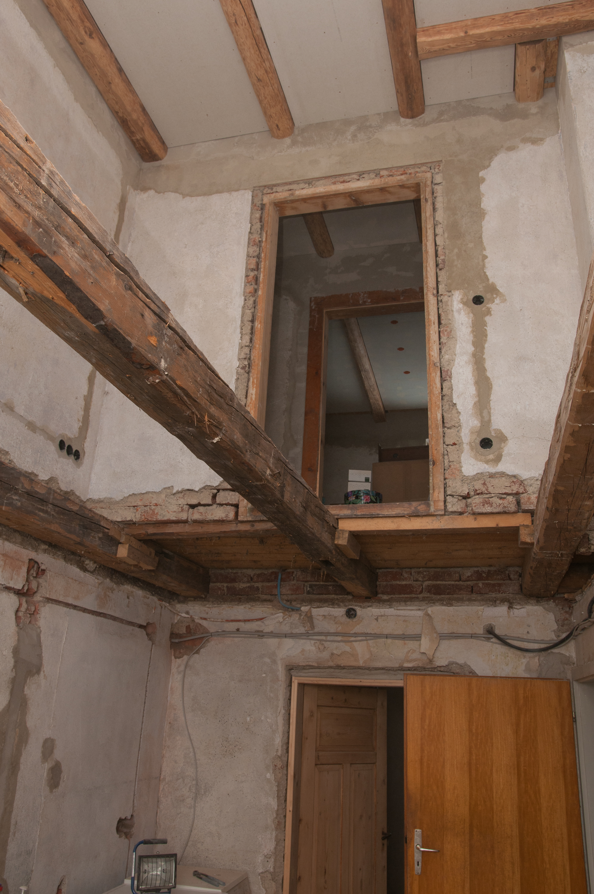 Zumindest ist mir nun klar, warum ich letztes Jahr aus Versehen einen Backstein aus der Wand heraustreten konnte: Das Gewicht der Mauer wird zwar von den drei Deckenbalken getragen, doch zwischen den äußeren Balken und dem Türrahmen haben Teile der Mauer keinerlei Halt nach unten, nachdem die Kanthölzer im Laufe der Jahre nachgegeben haben.
