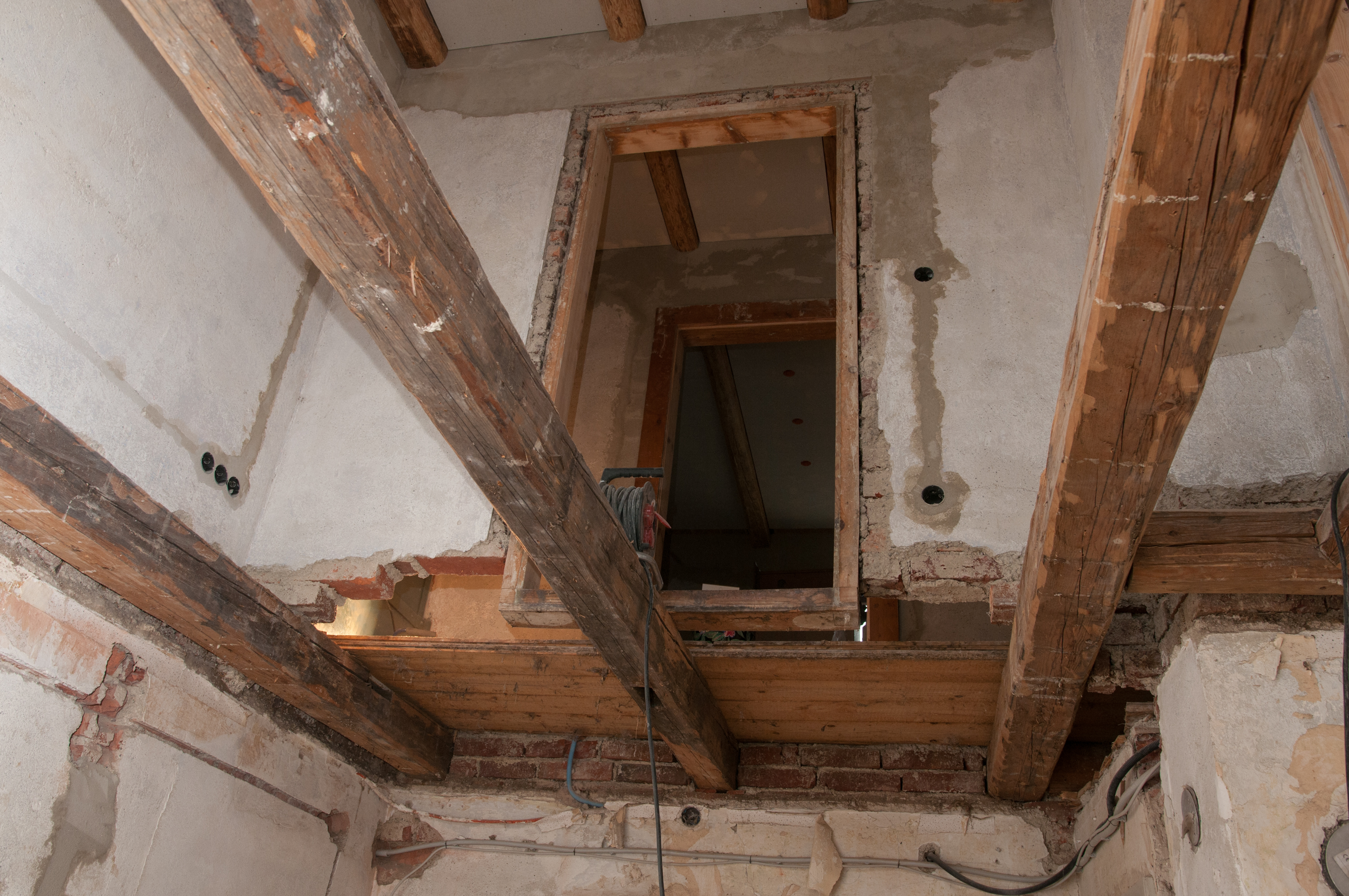 Schwebende Wände gibt es nicht? Doch, in Hausen gibt es so etwas. Nun, die Wand schwebt nicht wirklich, doch die lächerlichen Kanthölzer, auf denen sie ruht, sind kaum mehr, als bessere Dachlatten. Was wir da nach dem Öffnen der Decke zwischen Küche und erstem Stock entdeckt haben, lässt echt staunen. Was haben sich die Leute dabei gedacht, die das gemacht haben?