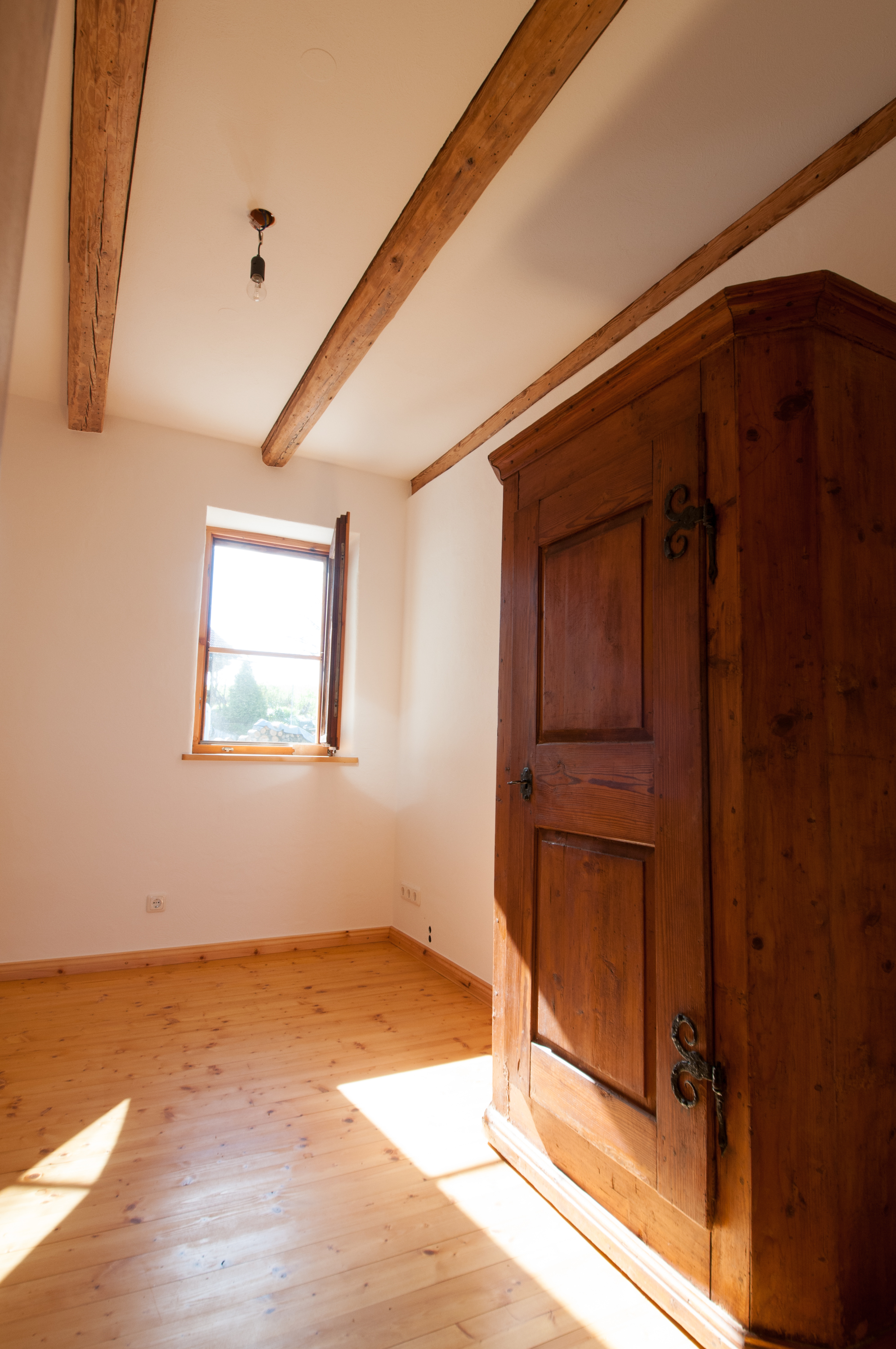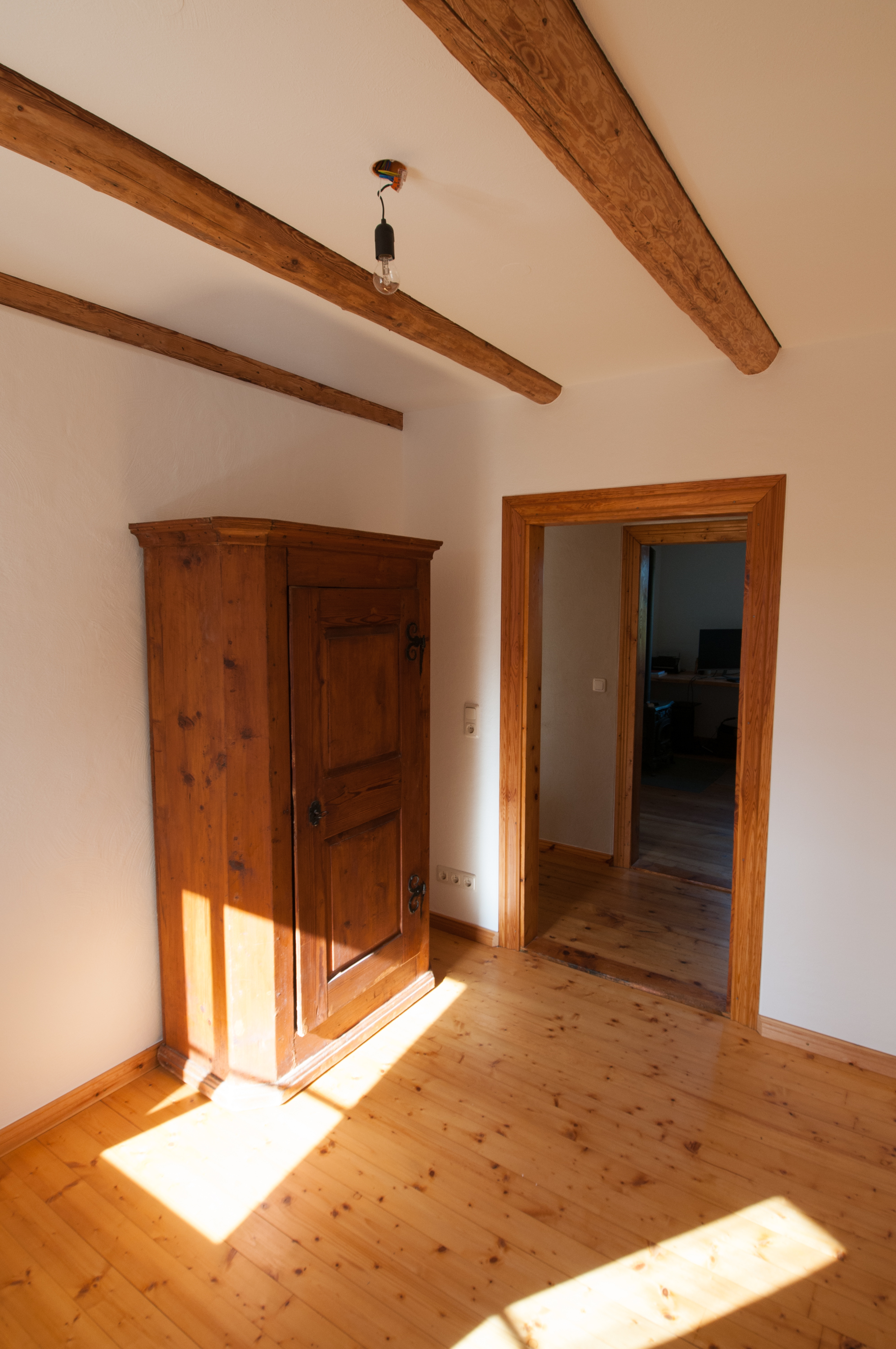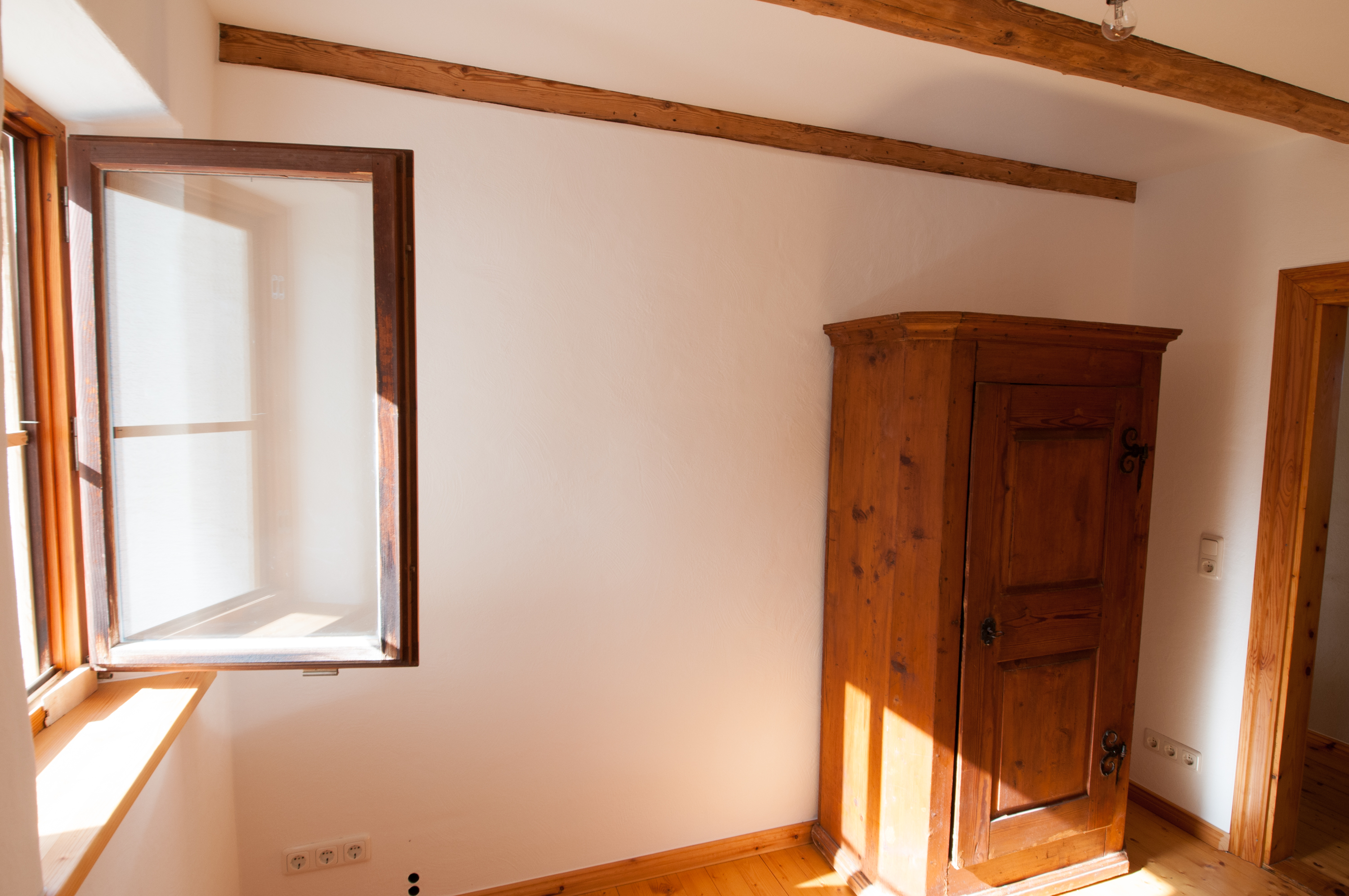 Nachdem dann auch noch alles verfugt war, konnte das Zimmer gestrichen werden. Wie beim Schlafzimmer habe ich auch hier gleich zwei Anstriche aufgetragen. Nicht, damit es weißer wird, sondern um der relativ empfindlichen Oberfläche des Kalkzementputzes etwas mehr Festigkeit zu geben.