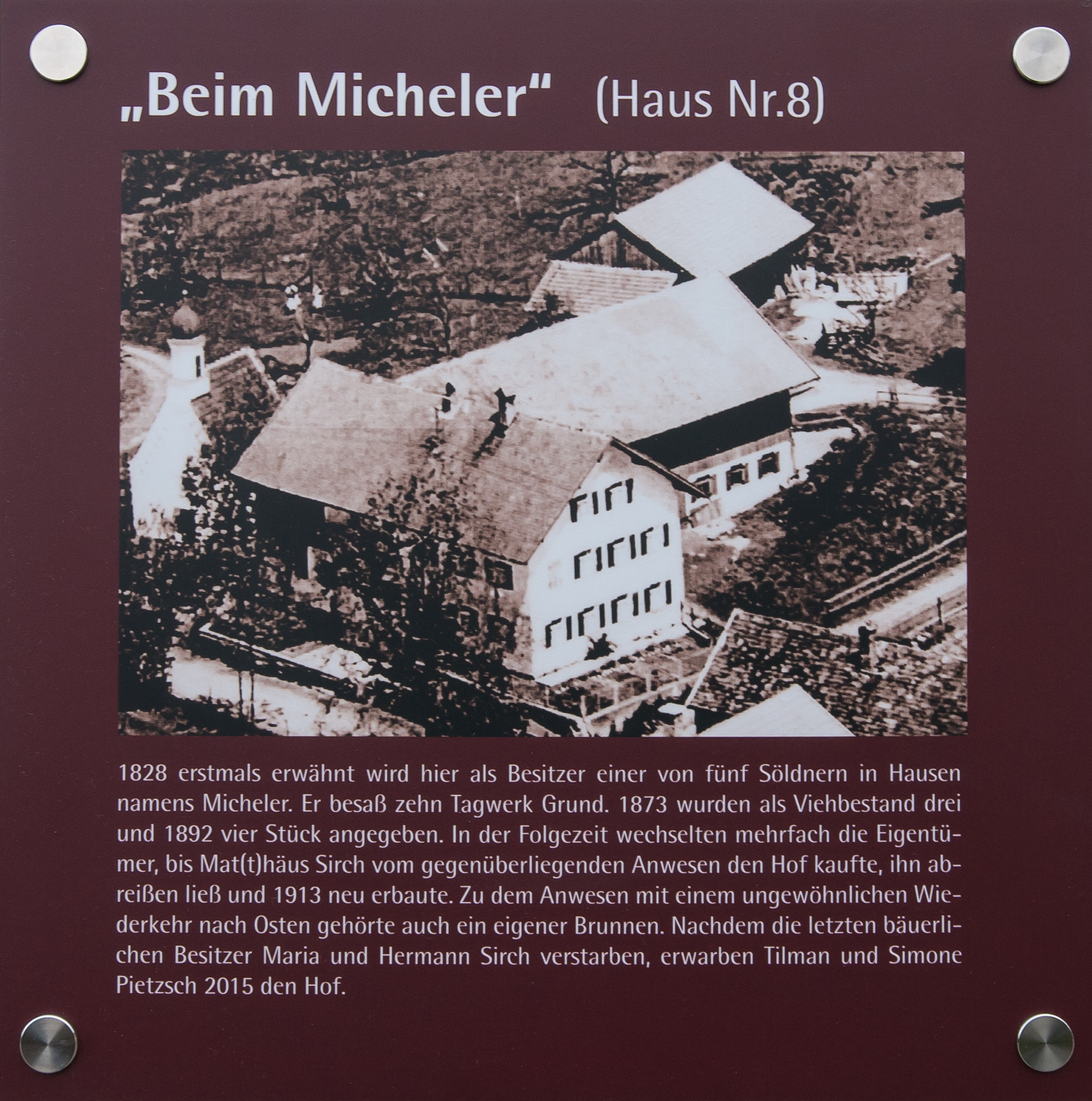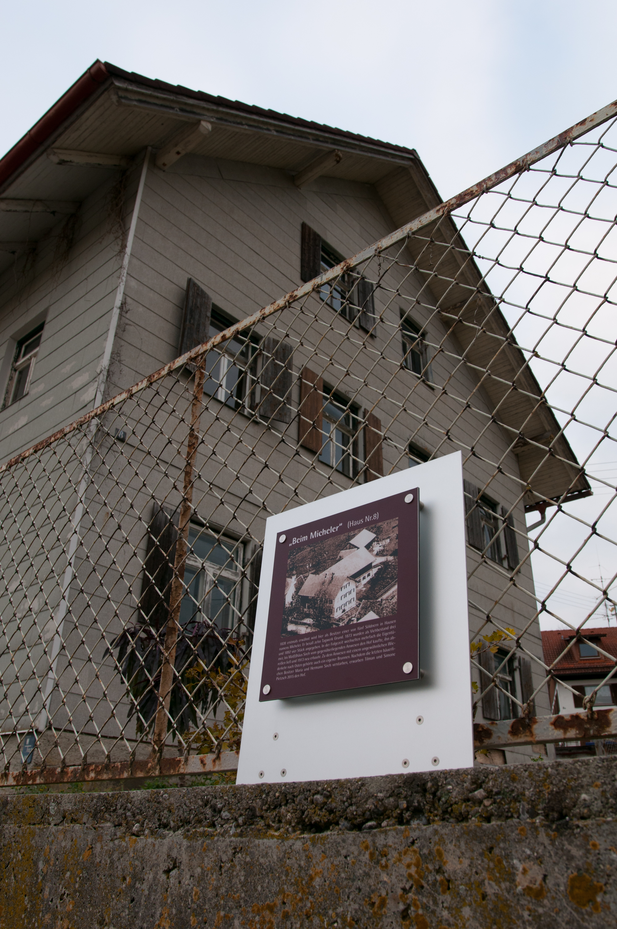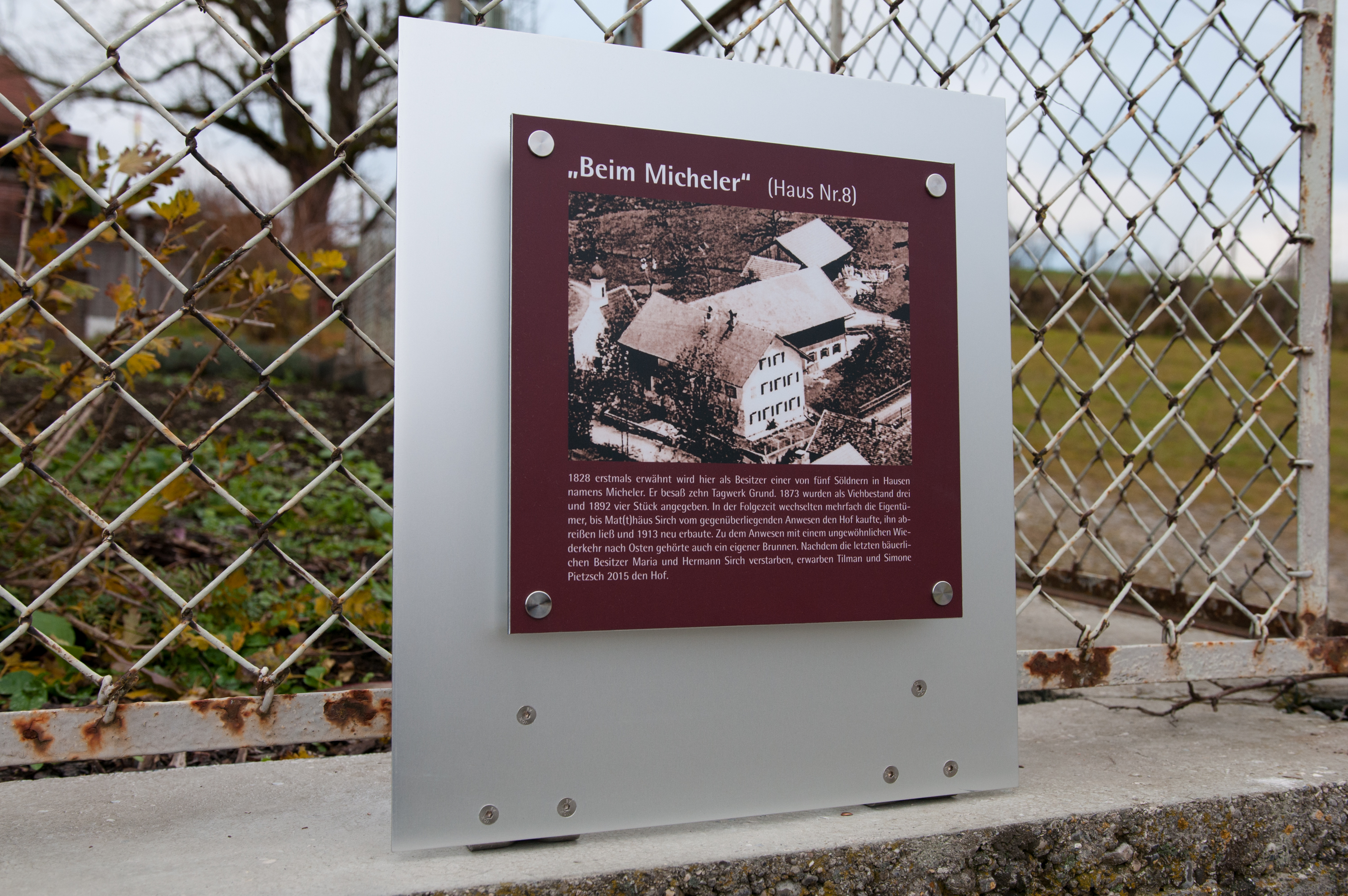 Im Gegensatz zu den meisten anderen Besitzern alter Häuser in der Gemeinde konnten wir die Tafel nicht einfach an der Fassade anbringen. Neben der Haustür wäre es vor Passanten verborgen geblieben und zur Straße hin ist die einzige erreichbare Mauer die des Vorgartens. Diese war jedoch zu niedrig, so dass die sinnvollste Lösung darin bestand, die Tafel auf der Mauer zu befestigen, wo sie in Augenhöhe ist und bequem gelesen werden kann.